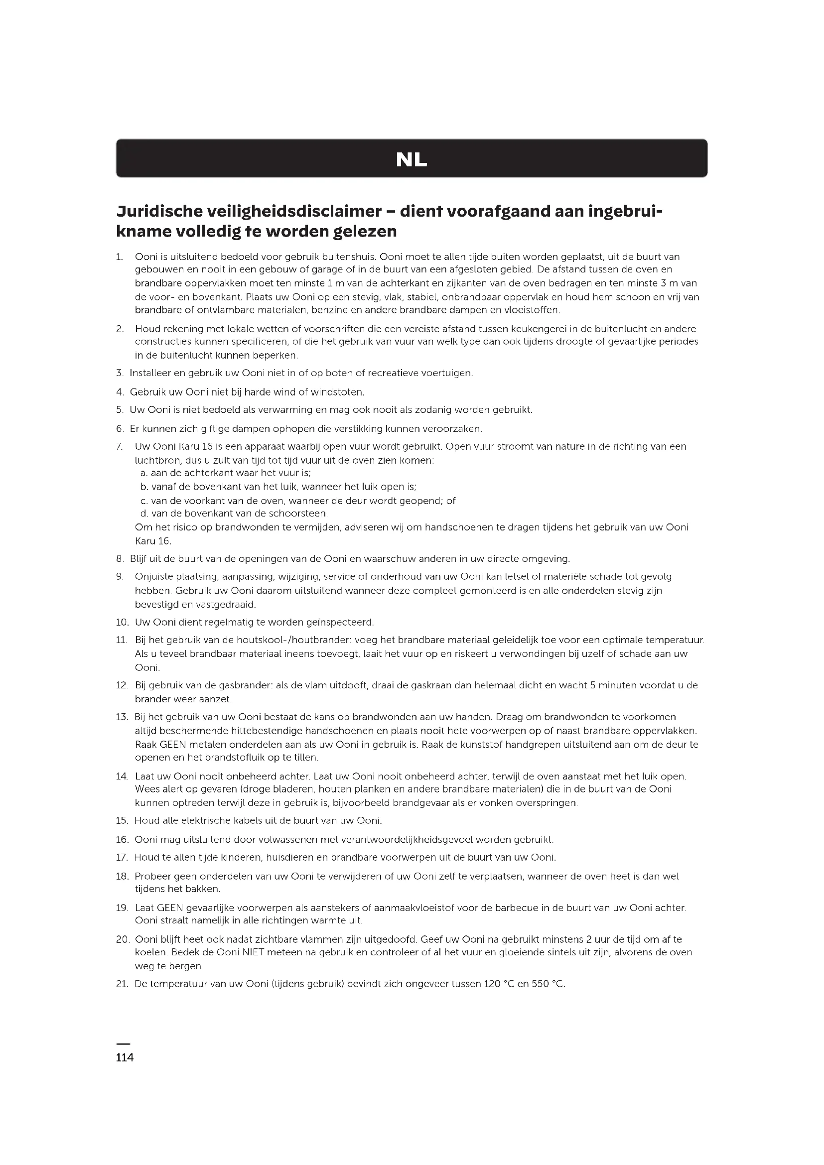 Ooni straalt namelijk in alle richtingen warmte uit. 20. Ooni blijft heet ook nadat zichtbare vlammen zijn uitgedoofd. Geef uw Ooni na gebruikt minstens 2 uur de tijd om af te koelen. Bedek de Ooni NIET meteen na gebruik en controleer of al het vuur en gloeiende sintels uit zijn, alvorens de oven weg te bergen.