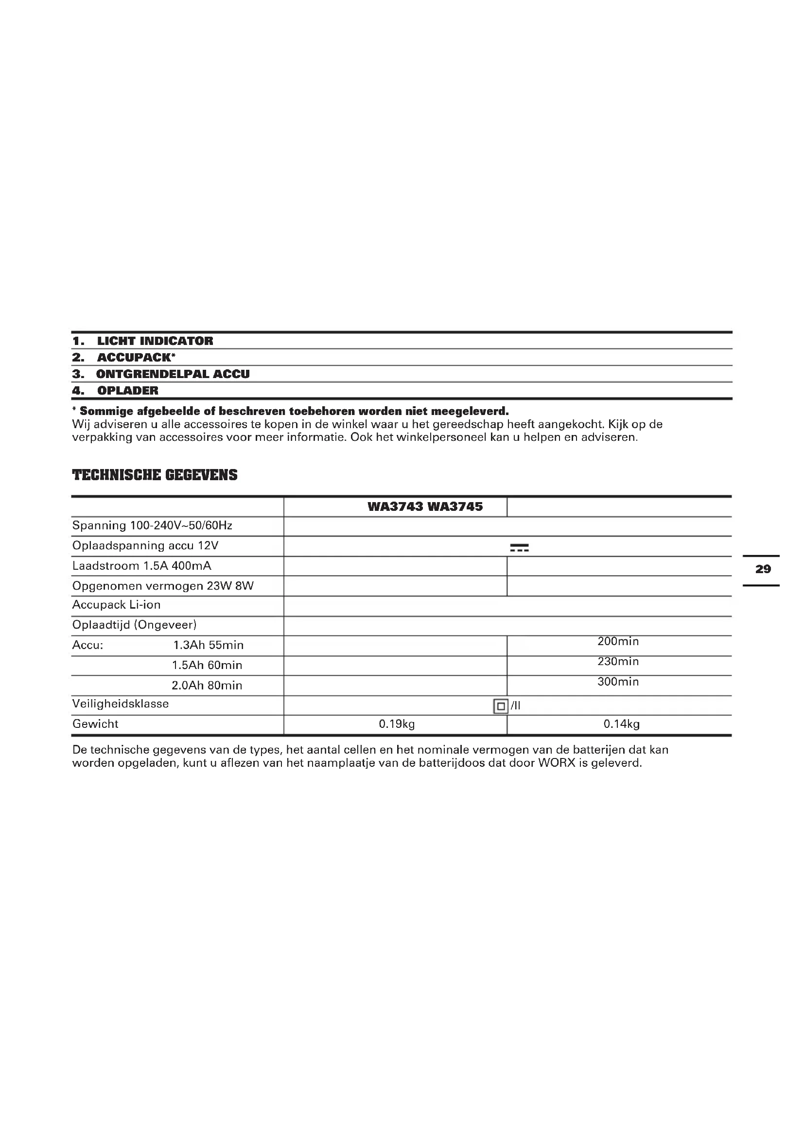 - Sommige afgebeelde of beschreven toebehoren worden niet meegeleverd. Wij adviseren u alle accessoires te kopen in de winkel waar u het gereedschap heeft aangekocht. Kijk op de verpakking van accessoires voor meer informatie. Ook het winkelpersoneel kan u helpen en adviseren. TECHNISCHE GEGEVENS WA3743 WA3745 Spanning 100-240V~50/60Hz Oplaadspanning accu 12V Laadstroom 1.5A 400mA Opgenomen vermogen 23W 8W Accupack Li-ion Oplaadtijd (Ongeveer) Accu: 1.3Ah 55min 200min 1.5Ah 60min 230min 2.0Ah 80min 300min Veiligheidsklasse /II Gewicht 0.19kg 0.14kg De technische gegevens van de types, het aantal cellen en het nominale vermogen van de batterijen dat kan worden opgeladen, kunt u aflezen van het naamplaatje van de batterijdoos dat door WORX is geleverd.30