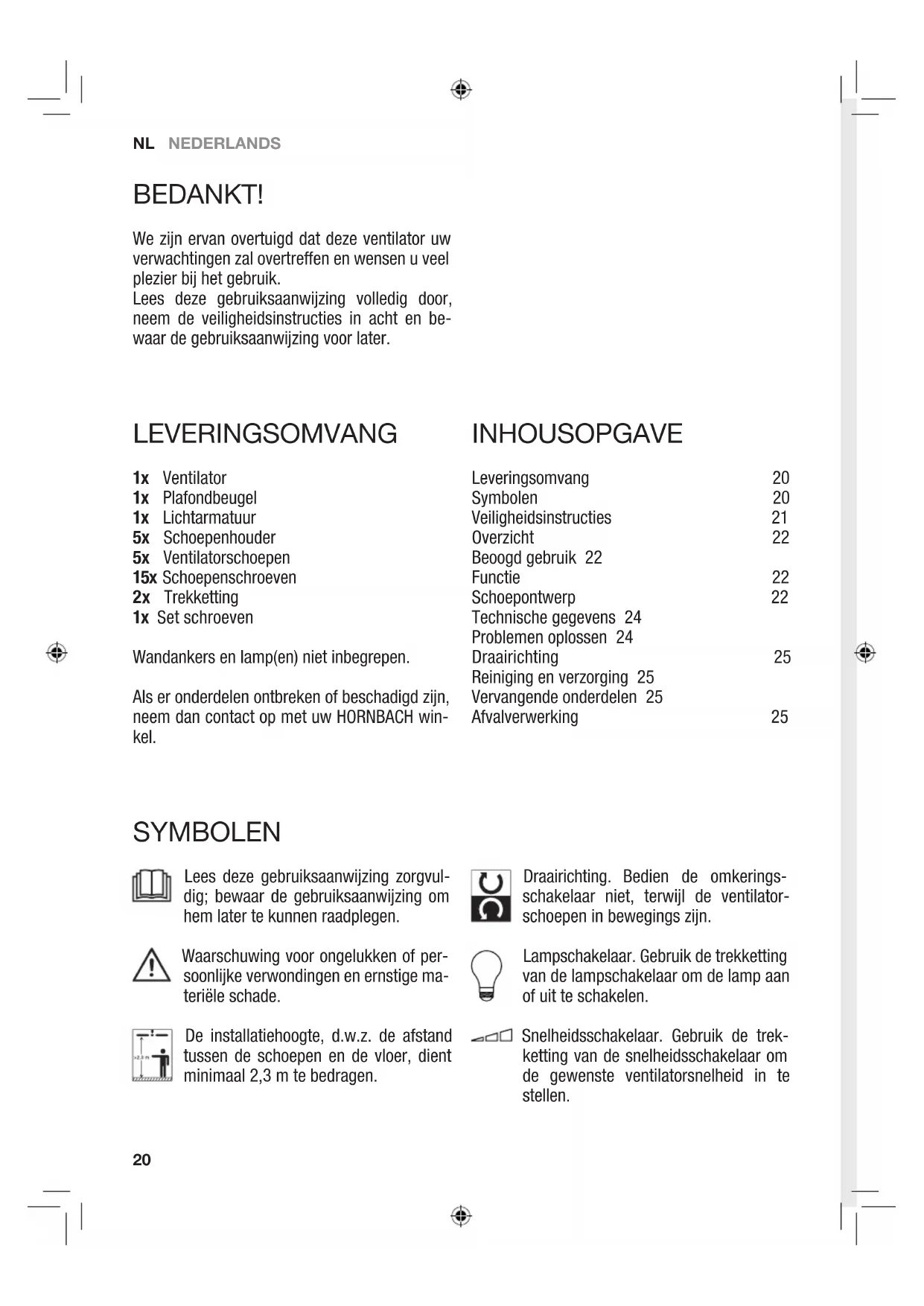 BEDANKT! We zijn ervan overtuigd dat deze ventilator uw verwachtingen zal overtreen en wensen u veel plezier bij het gebruik. Lees deze gebruiksaanwijzing volledig door, neem de veiligheidsinstructies in acht en be- waar de gebruiksaanwijzing voor later. INHOUSOPGAVE Leveringsomvang 20 Symbolen 20 Veiligheidsinstructies 21 Overzicht 22 Beoogd gebruik 22 Functie 22 Schoepontwerp 22 Technische gegevens 24 Problemen oplossen 24 Draairichting 25 Reiniging en verzorging 25 Vervangende onderdelen 25 Afvalverwerking 25 SYMBOLEN Lees deze gebruiksaanwijzing zorgvul- dig; bewaar de gebruiksaanwijzing om hem later te kunnen raadplegen. Waarschuwing voor ongelukken of per- soonlijke verwondingen en ernstige ma- teriële schade. De installatiehoogte, d.w.z. de afstand tussen de schoepen en de vloer, dient minimaal 2,3 m te bedragen. Draairichting. Bedien de omkerings- schakelaar niet, terwijl de ventilator- schoepen in bewegings zijn. Lampschakelaar. Gebruik de trekketting van de lampschakelaar om de lamp aan of uit te schakelen. Snelheidsschakelaar. Gebruik de trek- ketting van de snelheidsschakelaar om de gewenste ventilatorsnelheid in te stellen. LEVERINGSOMVANG 1x Ventilator 1x Plafondbeugel 1x Lichtarmatuur 5x Schoepenhouder 5x Ventilatorschoepen 15x Schoepenschroeven 2x Trekketting 1x Set schroeven Wandankers en lamp(en) niet inbegrepen. Als er onderdelen ontbreken of beschadigd zijn, neem dan contact op met uw HORNBACH win- kel.NEDERLANDS NL