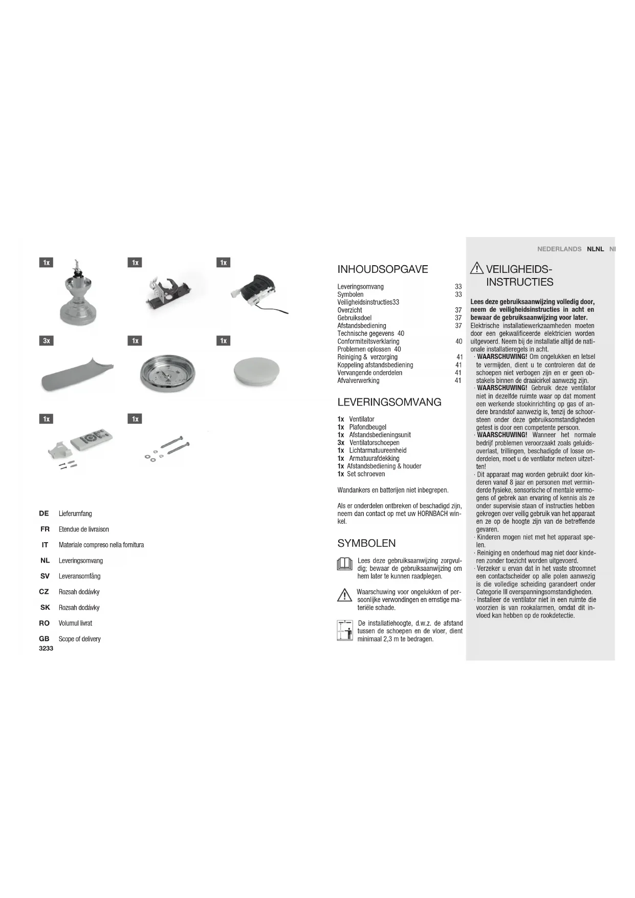 - Installeer de ventilator niet in een ruimte die voorzien is van rookalarmen, omdat dit in- vloed kan hebben op de rookdetectie. INHOUDSOPGAVE Leveringsomvang 33 Symbolen 33 Veiligheids instructies 33 Overzicht 37 Gebruiksdoel 37 Afstandsbediening 37 Technische gegevens 40 Conformiteitsverklaring 40 Problemen oplossen 40 Reiniging & verzorging 41 Koppeling afstandsbediening 41 Vervangende onderdelen 41 Afvalverwerking 41 Lieferumfang Etendue de livraison Materiale compreso nella fornitura Leveringsomvang Leveransomfång Rozsah dodávky Rozsah dodávky Volumul livrat Scope of delivery