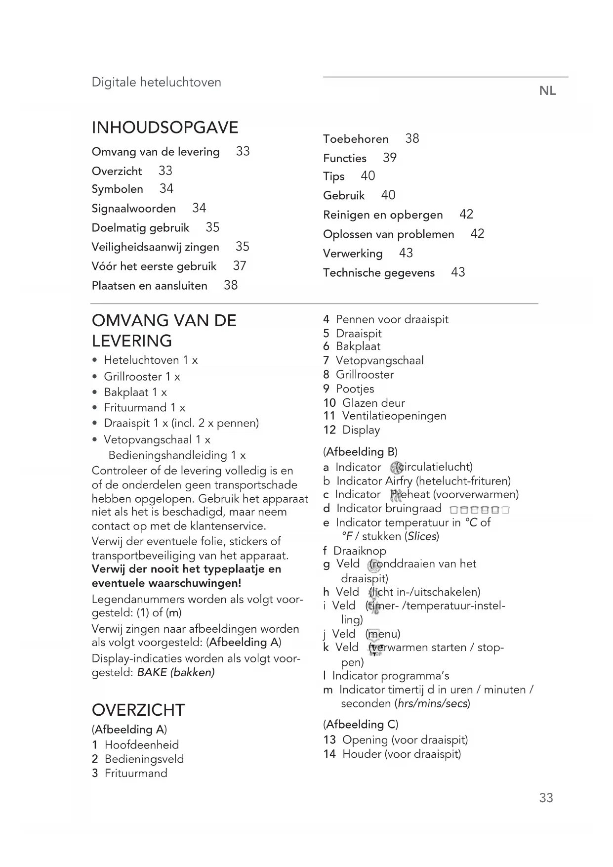 - Vetopvangschaal 1 x Bedieningshandleiding 1 x Controleer of de levering volledig is en of de onderdelen geen transportschade hebben opgelopen. Gebruik het apparaat niet als het is beschadigd, maar neem contact op met de klantenservice. Verwij der eventuele folie, stickers of transportbeveiliging van het apparaat. Verwij der nooit het typeplaatje en eventuele waarschuwingen! Legendanummers worden als volgt voor- gesteld: (1) of (m) Verwij zingen naar afbeeldingen worden als volgt voorgesteld: (Afbeelding A) Display-indicaties worden als volgt voor- gesteld: BAKE (bakken) OVERZICHT (Afbeelding A) 1 Hoofdeenheid 2 Bedieningsveld 3 Frituurmand 4 Pennen voor draaispit 5 Draaispit 6 Bakplaat 7 Vetopvangschaal 8 Grillrooster 9 Pootjes 10 Glazen deur 11 Ventilatieopeningen 12 Display (Afbeelding B) a Indicator (circulatielucht) b Indicator Airfry (hetelucht-frituren) c Indicator Preheat (voorverwarmen) d Indicator bruingraad e Indicator temperatuur in °C of °F / stukken (Slices) f Draaiknop g Veld (ronddraaien van het draaispit) h Veld (licht in-/uitschakelen) i Veld (timer- /temperatuur-instel- ling) j Veld (menu) k Veld (verwarmen starten / stop- pen) l Indicator programma’s m Indicator timertij d in uren / minuten / seconden (hrs/mins/secs) (Afbeelding C) 13 Opening (voor draaispit) 14 Houder (voor draaispit)NL