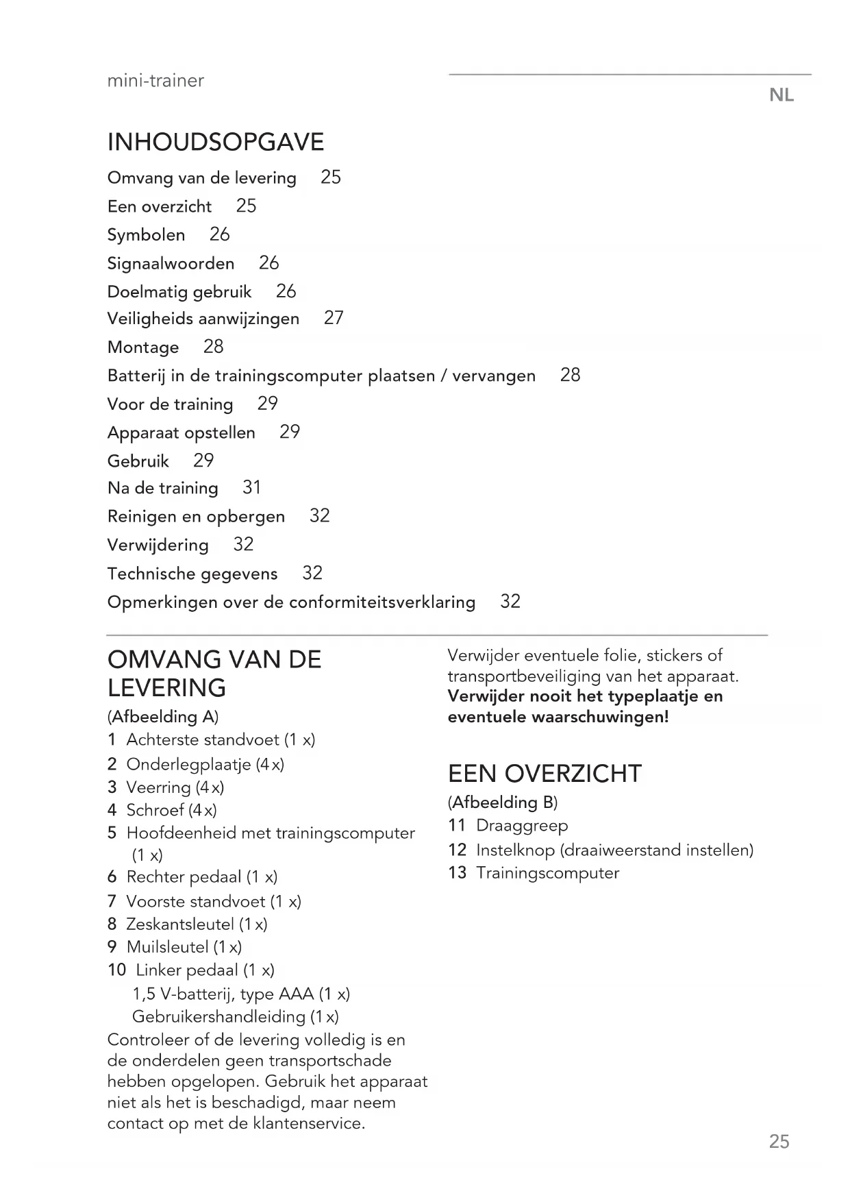 INHOUDSOPGAVE Omvang van de levering 25 Een overzicht 25 Symbolen 26 Signaalwoorden 26 Doelmatig gebruik 26 Veiligheids aanwijzingen 27 Montage 28 Batterij in de trainingscomputer plaatsen / vervangen 28 Voor de training 29 Apparaat opstellen 29 Gebruik 29 Na de training 31 Reinigen en opbergen 32 Verwijdering 32 Technische gegevens 32 Opmerkingen over de conformiteitsverklaring 32
