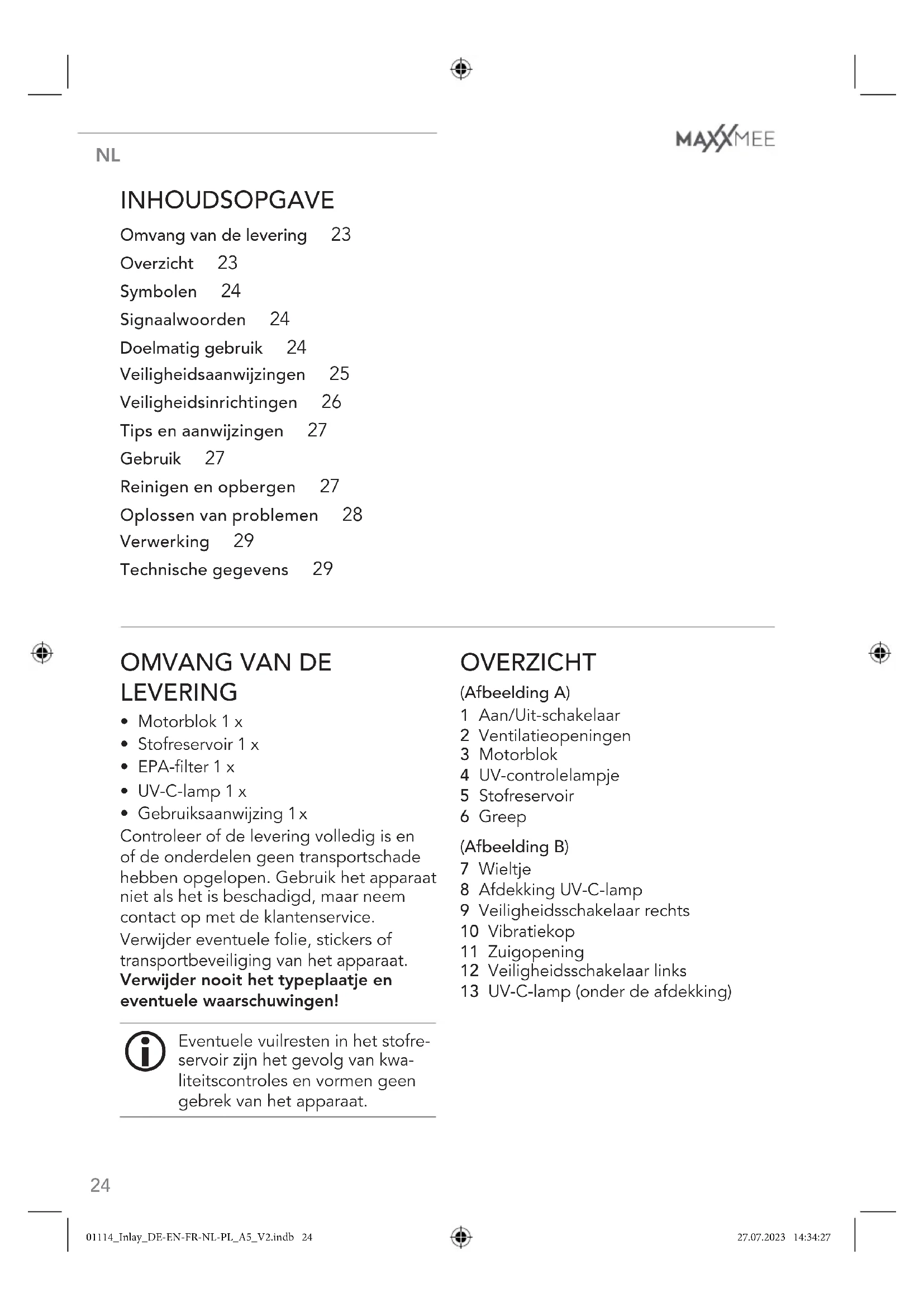 Eventuele vuilresten in het stofre- servoir zijn het gevolg van kwa- liteitscontroles en vormen geen gebrek van het apparaat. OVERZICHT (Afbeelding A) 1 Aan/Uit-schakelaar 2 Ventilatieopeningen 3 Motorblok 4 UV-controlelampje 5 Stofreservoir 6 Greep (Afbeelding B) 7 Wieltje 8 Afdekking UV-C-lamp 9 Veiligheidsschakelaar rechts 10 Vibratiekop 11 Zuigopening 12 Veiligheidsschakelaar links 13 UV-C-lamp (onder de afdekking) INHOUDSOPGAVE Omvang van de levering 23 Overzicht 23 Symbolen 24 Signaalwoorden 24 Doelmatig gebruik 24 Veiligheidsaanwijzingen 25 Veiligheidsinrichtingen 26 Tips en aanwijzingen 27 Gebruik 27 Reinigen en opbergen 27 Oplossen van problemen 28 Verwerking 29 Technische gegevens 29 01114_Inlay_DE-EN-FR-NL-PL_A5_V2.indb 2401114_Inlay_DE-EN-FR-NL-PL_A5_V2.indb 24 27.07.2023 14:34:2727.07.2023 14:34:27Handstofzuiger voor mijten Compact