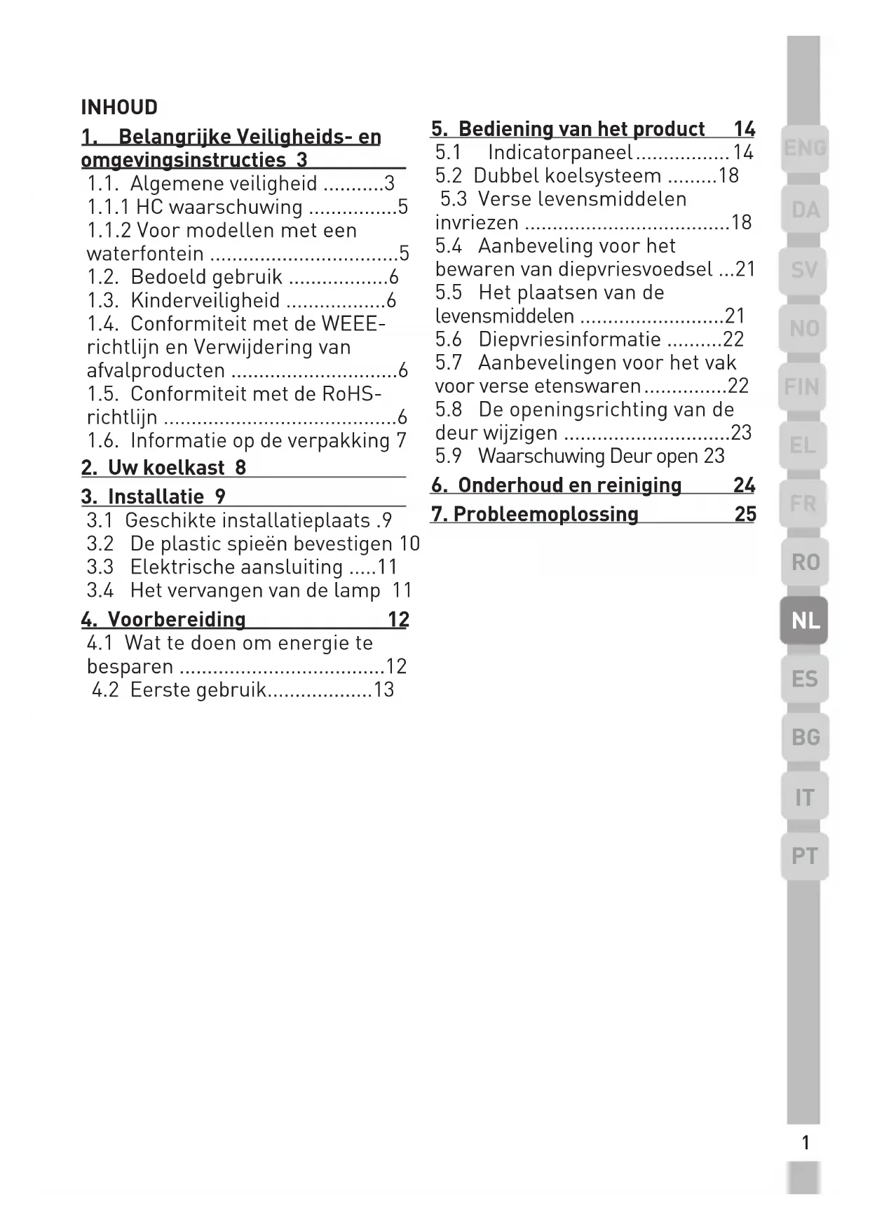 DISCLAIMER / WAARSCHUWING Sommige (eenvoudige) defecten kunnen correct worden behandeld door de eindgebruiker zonder dat dit aanleiding geeft tot veiligheidsproblemen of een onveilig gebruik, op voorwaarde dat ze worden uitgevoerd binnen de limieten en in overeenstemming met de volgende instructies (zie het hoofdstuk “Zelf-reparatie”). Om die reden, tenzij anderzijds toegelaten in het onderstaande hoofdstuk ‘Zelf-reparatie”, moeten reparaties worden uitgevoerd door geregistreerde professionele monteurs om veiligheidsproblemen te voorkomen. Een geregistreerde professionele monteur is een professionele monteur die toegang heeft gekregen tot de instructies en de lijst met reserveonderdelen van dit product door de fabrikant, in overeenstemming met de methoden beschreven in wetsbesluiten in overeenstemming met Richtlijn 2009/125/EC. Hoewel, de onderhouds- en reparatiewerken in het kader van de garantievoorwaarden mogen uitsluitend worden uitgevoerd door de gespecialiseerd vertegenwoordiger (m.a.w. geautoriseerde professionele monteurs) die u kunt bereiken via het telefoonnummer vermeld in de gebruikshandleiding/garantiekaart of via uw geautoriseerde verdeler. Om die reden zullen reparaties die worden uitgevoerd door professionele monteurs (die niet zijn geautoriseerd door Grundig) de garantie nietig verklaren. Zelf-reparatie De eindgebruiker kan de volgende reserveonderdelen zelf repareren: deur handgrepen, deur scharnieren, laden, manden en deurpakkingen (een bijgewerkte lijst is ook beschikbaar op support.grundig.com op 1 maart 2021). Bovendien, om de veiligheid van het product te garanderen en het risico van ernstig letsel te voorkomen, moet de vermelde zelf-reparatie worden uitgevoerd in overeenstemming met de instructies in de handleiding voor zelf- reparatie of die beschikbaar is in in support. grundig.com Uit veiligheidsoverwegingen moet u de stekker van het product loskoppelen voor u een zelf-reparatie probeert uit te voeren. Reparaties en pogingen tot reparatie door eindgebruikers van onderdelen die niet zijn omvat in deze lijst en/of waarbij de instructies in de handleiding voor zelf-reparatie of die beschikbaar zijn in support.grundig.com niet worden nageleefd, kunnen resulteren in veiligheidsproblemen die niet kunnen worden toegewezen aan Grundig en deze zullen de garantie van het product nietig verklaren. Om die reden raden wij ten stelligste af dat eindgebruikers op eigen houtje reparaties proberen uit te voeren die buiten de vermelde lijst van reserveonderdelen vallen en in dergelijke situaties beroep doen op een geautoriseerde professionele monteur of geregistreerde professionele monteurs. Dergelijke pogingen van eindgebruikers kunnen daarentegen veiligheidsproblemen en schade aan het product veroorzaken en resulteren in brand, overstromingen, elektrische schokken en ernstig persoonlijk letsel. Als voorbeeld, maar niet beperkt tot, de volgende reparaties moeten worden uitgevoerd door geautoriseerde professionele servicemonteurs of geregistreerde professionele monteurs: compressor, koelcircuit, moederbord,omzetter bord, weergavebord, etc.30 De fabrikant/verkoper kan niet aansprakelijk worden gesteld wanneer eindgebruikers de bovenstaande instructies niet naleven. De beschikbaarheid van de reserveonderdelen van de koelkast die u hebt gekocht is 10 jaar. Tijdens deze periode zijn de originele reserveonderdelen beschikbaar voor de correcte werking van uw koelkast. De minimale duur van de garantie van de koelkast die u hebt gekocht, is 24 maanden. Dit product is uitgerust met een lichtbron van de "G"-energieklasse. De lichtbron in dit product mag enkel worden vervangen door professionele reparateurs.ES / BG / IT 58 4779 0000/AF 4/5 GKN 27940 FXN Manual del usuario Refrigerador