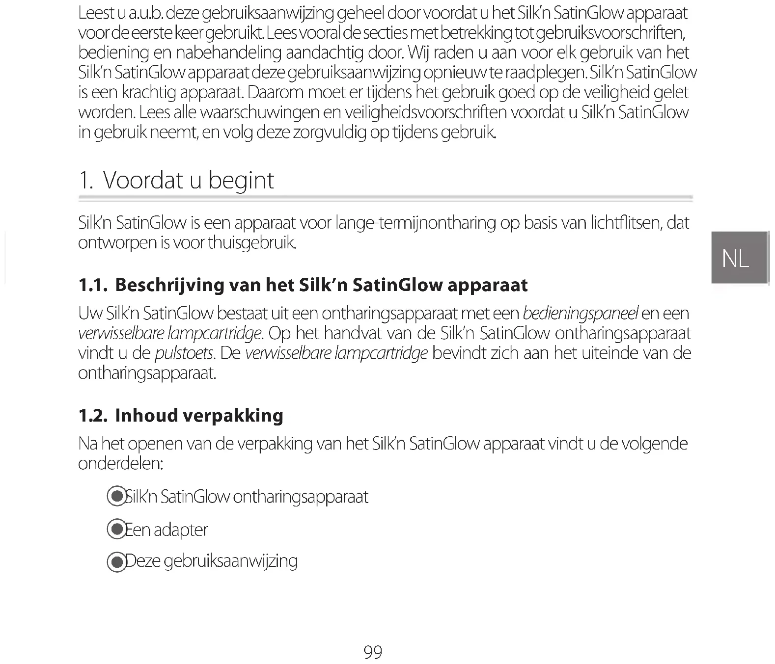 Leest u a.u.b. deze gebruiksaanwijzing geheel door voordat u het Silk’n SatinGlow apparaat voor de eerste keer gebruikt. Lees vooral de secties met betrekking tot gebruiksvoorschriften, bediening en nabehandeling aandachtig door. Wij raden u aan voor elk gebruik van het Silk’n SatinGlow apparaat deze gebruiksaanwijzing opnieuw te raadplegen. Silk’n SatinGlow is een krachtig apparaat. Daarom moet er tijdens het gebruik goed op de veiligheid gelet worden. Lees alle waarschuwingen en veiligheidsvoorschriften voordat u Silk’n SatinGlow in gebruik neemt, en volg deze zorgvuldig op tijdens gebruik.