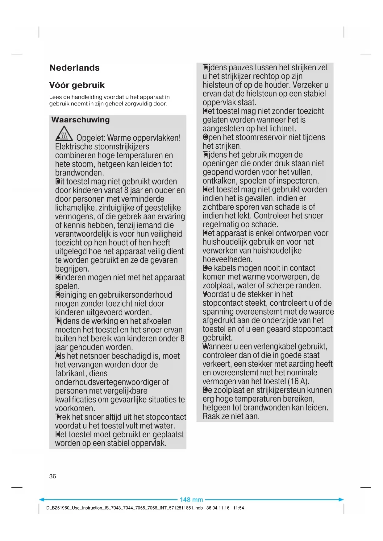DLB251960_Use_Instruction_IS_7043_7044_7055_7056_INT_5712811851.indb 35 04.11.16 11:54Nederlands Vóór gebruik Lees de handleiding voordat u het apparaat in gebruik neemt in zijn geheel zorgvuldig door. Waarschuwing