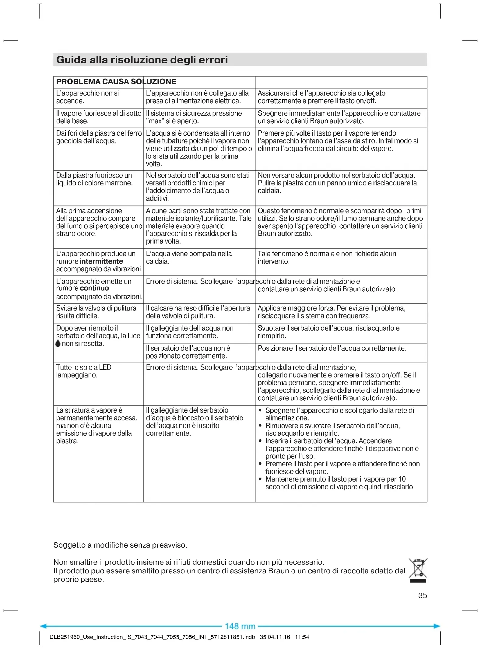 - Houd de stoomknop gedurende 10 seconden ingedrukt zodat stoom wordt uitgestoten, laat de knop dan los. Onderhevig aan wijzigingen zonder voorafgaande kennisgeving. Gooi het product niet bij het huishoudelijk afval aan het eind van zijn levensduur. Breng het voor verwijdering naar een Servicecentrum van Braun of naar een geschikt inzamelpunt in uw land.