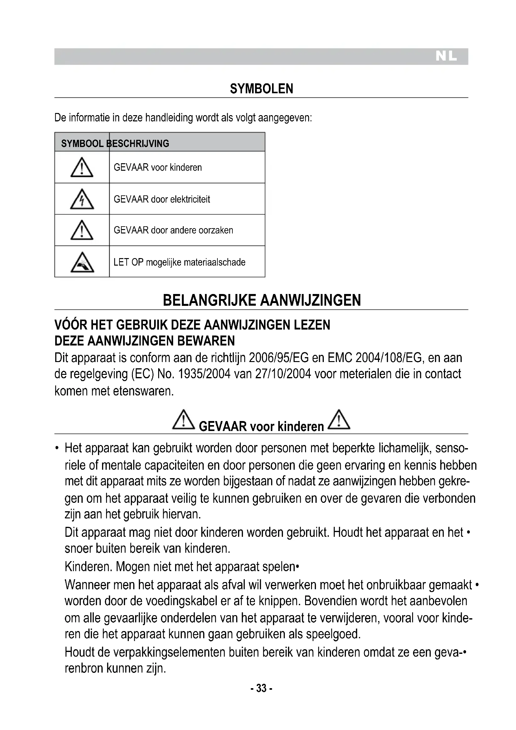 Dit apparaat is conform aan de richtlijn 2006/95/EG en EMC 2004/108/EG, en aan de regelgeving (EC) No. 1935/2004 van 27/10/2004 voor meterialen die in contact komen met etenswaren. GEVAAR voor kinderen Het apparaat kan gebruikt worden door personen met beperkte lichamelijk, senso-• riele of mentale capaciteiten en door personen die geen ervaring en kennis hebben met dit apparaat mits ze worden bijgestaan of nadat ze aanwijzingen hebben gekre- gen om het apparaat veilig te kunnen gebruiken en over de gevaren die verbonden zijn aan het gebruik hiervan. Dit apparaat mag niet door kinderen worden gebruikt. Houdt het apparaat en het • snoer buiten bereik van kinderen. Kinderen. Mogen niet met het apparaat spelen• Wanneer men het apparaat als afval wil verwerken moet het onbruikbaar gemaakt • worden door de voedingskabel er af te knippen. Bovendien wordt het aanbevolen om alle gevaarlijke onderdelen van het apparaat te verwijderen, vooral voor kinde- ren die het apparaat kunnen gaan gebruiken als speelgoed. Houdt de verpakkingselementen buiten bereik van kinderen omdat ze een geva-• renbron kunnen zijn.NL