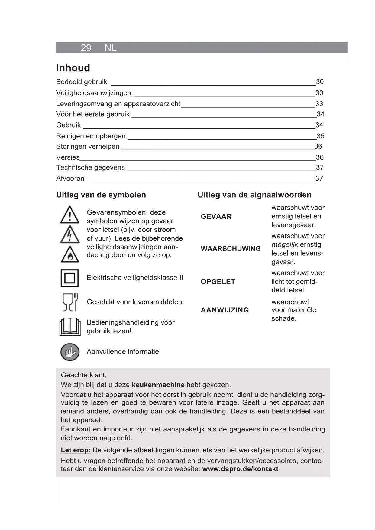 - Alle gebreken die door een onjuiste behandeling, beschadiging, verkalking of re- paratiepogingen ontstaan, zijn uitgesloten van garantie. Dit geldt ook voor normale slijtage. Veiligheidsaanwijzingen WAARSCHUWING: alle veiligheidsaanwijzingen, aanwij- zingen, afbeeldingen en technische gegevens die zijn aangebracht op dit apparaat, lezen. Nalatigheid bij het na- leven van de veiligheidsinstructies en aanwijzingen kan een elektrische schok, brand en / of letsel tot gevolg hebben. ■ Dit apparaat kan worden gebruikt door personen met beperkte lichamelijke, sensorische of geestelijke vermogens of die niet beschikken over ervaring en / of kennis, wanneer zij onder toe- zicht staan en instructies hebben gekregen over hoe het appa- raat op veilige wijze kan worden gebruikt en wanneer zij de daar- uit voortvloeiende gevaren hebben begrepen. ■ Het apparaat mag niet worden gebruikt door kinderen. Kinde- ren en huisdieren dienen buiten het bereik van het apparaat en het netsnoer te blijven! ■ Het apparaat is geen speelgoed! ■ Het apparaat is niet bedoeld om te worden ingezet in combinatie met een externe tijdschakelaar of een apart afstandsbedienings- systeem. ■ Dompel het apparaat, het netsnoer en de netstekker nooit in wa- ter of andere vloeistoffen, en zorg ervoor dat deze niet in het water kunnen vallen of nat kunnen worden. ■ Wanneer het apparaat niet onder toezicht staat, tijdens het mon- teren en demonteren alsook vóór het reinigen moet het altijd van het stroomnet worden geïsoleerd. ■ Geen veranderingen aanbrengen aan het apparaat. Het nets- noer mag niet zelf worden verwisseld. Wanneer het apparaat,31 NL het netsnoer of de netstekker van het apparaat is beschadigd, dan moeten deze door de fabrikant, klantenservice of een soort- gelijk gekwalifi ceerde persoon (bijv. gespecialiseerde werk- plaats) worden vervangen, om gevaren te voorkomen. ■ Beslist de aanwijzingen in het hoofdstuk ‘Reinigen en onder- houd’ in acht nemen. GEVAAR – Gevaar voor een elektrische schok ■ Dompel het motorblok, het netsnoer en de netstekker nooit in water of andere vloei- stoffen, en zorg ervoor dat deze niet in het water kunnen vallen of nat kunnen worden. ■ Mocht het apparaat in het water vallen, onderbreekt u meteen de stroomtoevoer. Probeer niet om het apparaat uit het water te trekken, terwijl het is aangesloten op het stroomnet! ■ Raak het apparaat, het netsnoer en de netstekker nooit aan met vochtige handen wanneer deze onderdelen zijn aangesloten op het stroomnet. WAARSCHUWING – Gevaar voor verwondingen ■ Waarschuwing voor verstikking! Houd kinderen en dieren uit de buurt van het verpakkingsmateriaal. ■ Gevaar voor wurging! Zorg ervoor dat het netsnoer steeds buiten bereik is van kleine kinderen en dieren. ■ Voorzicht: risico voor verwondingen door draaiende apparaatonderdelen! Houd kleding, sieraden, haar, handen en andere lichaamsdelen uit de buurt van het apparaat zodat niets verstrikt kan raken in draaiende apparaatonderdelen. ■ Voorzicht: risico voor verbrandingen! Gebruik geen hete levensmiddelen in het apparaat omdat deze tijdens het gebruik eruit zouden kunnen spatten. ■ Valgevaar! Zorg ervoor dat niemand kan struikelen over het aangesloten netsnoer. Het netsnoer mag niet naar beneden hangen vanaf de plaats waar het apparaat is geplaatst, om te voorkomen dat het apparaat naar beneden wordt getrokken. ■ Beweeg het apparaat niet tijdens de werking. Let op dat het apparaat voldoende stevig staat! WAARSCHUWING – Brandgevaar ■ Het apparaat alleen aansluiten op een contactdoos die is geïnstalleerd volgens de voorschriften. De contactdoos moet ook na het aansluiten goed toegankelijk zijn, zodat de verbinding met het lichtnet snel kan worden geïsoleerd. De netspanning moet overeenstemmen met het typeplaatje van het apparaat. Gebruik alleen correct werkende verlengsnoeren, waarvan de technische gegevens overeenstemmen met die van het apparaat. ■ Gebruik het apparaat niet in ruimten, waarin zich licht ontvlambaar stof of giftige en explosieve dampen bevinden. ■ Het apparaat niet gebruiken in de buurt van brandbaar materiaal. Leg geen brand- bare materialen (bijv. karton, papier, kunststof) op of in het apparaat.NL 32 ■ Het apparaat tijdens de werking niet afdekken. ■ Steek geen voorwerpen in de ventilatiesleuven van het apparaat en let erop dat de ventilatiesleuven niet worden geblokkeerd door voorwerpen. ■ Bij brand: niet met water blussen! Doof vlammen met een blusdeken of met een geschikte brandblusser. AANWIJZING – Gevaar voor materiële schade ■ Plaats het apparaat altijd op een droge, effen en vaste ondergrond met voldoende speelruimte eromheen. ■ Het apparaat alleen gebruiken wanneer het correct werd gemonteerd! ■ Het apparaat niet op of naast warmtebronnen zoals kookplaten of ovens plaatsen. Open vuur, bijv. brandende kaarsen, uit de buurt houden van het apparaat, snoer en stekker. ■ Let op dat het netsnoer niet bekneld raakt, geknikt of over scherpe randen gelegd wordt en dat het niet in aanraking komt met hete oppervlakken. ■ Het netsnoer mag niet naar beneden hangen vanaf de standplaats van het apparaat, om te voorkomen dat het apparaat naar beneden wordt getrokken. ■ Schakel het apparaat uit en trek de netstekker uit de contactdoos, wanneer tijdens gebruik een storing optreedt of vóór een onweersbui. ■ Wanneer de netstekker uit de contactdoos wordt getrokken, altijd aan de netstekker en nooit aan het netsnoer trekken. ■ Het apparaat niet aan het netsnoer trekken of dragen. ■ Het apparaat niet gebruiken zonder levensmiddelen. Dat kan oververhitting en scha- de aan de motor veroorzaken. ■ Gebruik uitsluitend originele reserveonderdelen van de fabrikant. Bij gebruik van niet door de fabrikant toegelaten accessoires vervalt elke aanspraak op garantie. ■ Zet nooit zware voorwerpen op het apparaat. ■ Bescherm het apparaat tegen andere warmtebronnen, open vuur, temperaturen onder nul, lang aanhoudend vocht, natheid
