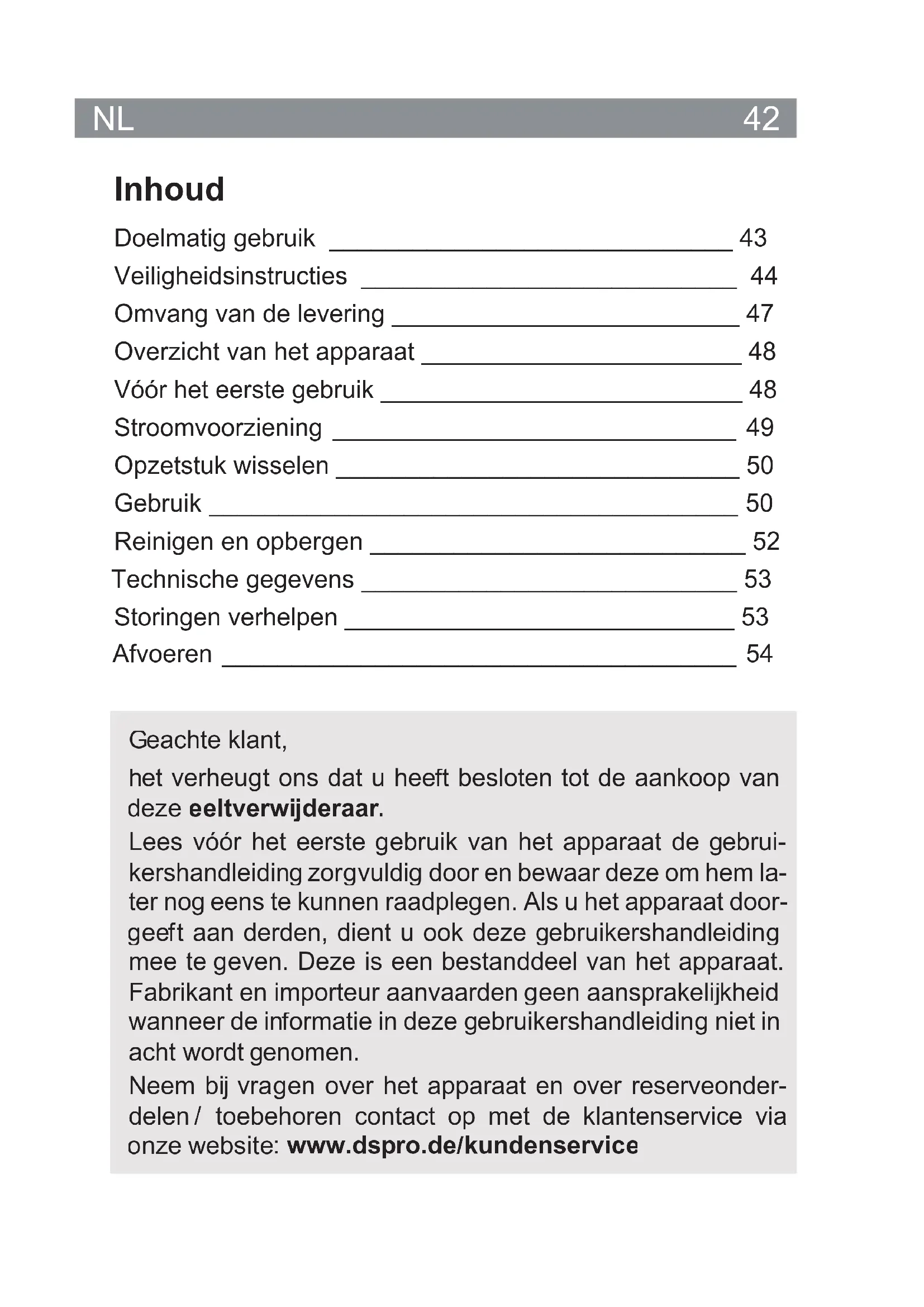 kinderen en dieren onbereikbare plaats.53 NL Technische gegevens Artikelnummer: 06200 Model: BG-F-900 Spanningsvoeding: 6 V DC (4 x 1,5 V-batterij, type AAA) ID gebruikershandleiding: Z 06200 M DS V1 0518 Storingen verhelpen Wanneer het apparaat niet op de juiste wijze functioneert, kunt u nagaan of u een probleem zelf kunt oplossen. Neem contact op met de klantenservice als het probleem met de genoemde stappen niet kan worden opgelost. Probeer niet om een elektrisch apparaat zelf te repareren! Probleem Mogelijke oorzaak / oplossing Het apparaat werkt niet. Bij gebruik van batterijen: Zijn de batterijen bijna leeg of verkeerd ge- plaatst? Eventueel nieuwe batterijen plaatsen resp. polariteit controleren. USB-kabel: Zitten de steekverbindin- gen juist? De plaatsing corrigeren. Is de contactdoos defect? Probeer een andere contactdoos. Is de netadapter defect of niet ge- schikt? Andere netadapter proberen. Is er geen netspanning voorhanden? De zekering in de zekeringenkast controleren. Het eelt wordt niet goed verwijderd. Het opzetstuk (8) is versleten. Het opzetstuk vervangen.NL 54 Probleem Mogelijke oorzaak / oplossing Het apparaat zuigt niet goed. Is het fi lter vervuild? Het fi lter reini- gen. Eventueel moet het fi lter worden vervangen. Afvoeren Verwijder het verpakkingsmateriaal op milieuvriendelij- ke wijze en breng dit naar een recyclepunt. De batterijen moeten vóór het afvoeren van het ap- paraat worden verwijderd en gescheiden van het ap- paraat op de desbetreffende verzamelpunten worden afgedankt. Dit apparaat valt onder de Europese richtlijn 2012/19/ EU voor afgedankte elektrische en elektronische appa- ratuur (Waste Electrical and Electronical Equipment - WEEE). Dit apparaat mag niet bij het normale huisafval worden gedaan, maar dient milieuvriendelijk verwerkt te worden door een erkend afvalverwerkingsbedrijf. Klantenservice / Importeur: DS Produkte GmbH Am Heisterbusch 1, D-19258 Gallin, Duitsland Tel.: +49 38851 314650 (Bellen naar het Duitse vaste netwerk tegen het tarief van uw provider.) Alle rechten voorbehouden.