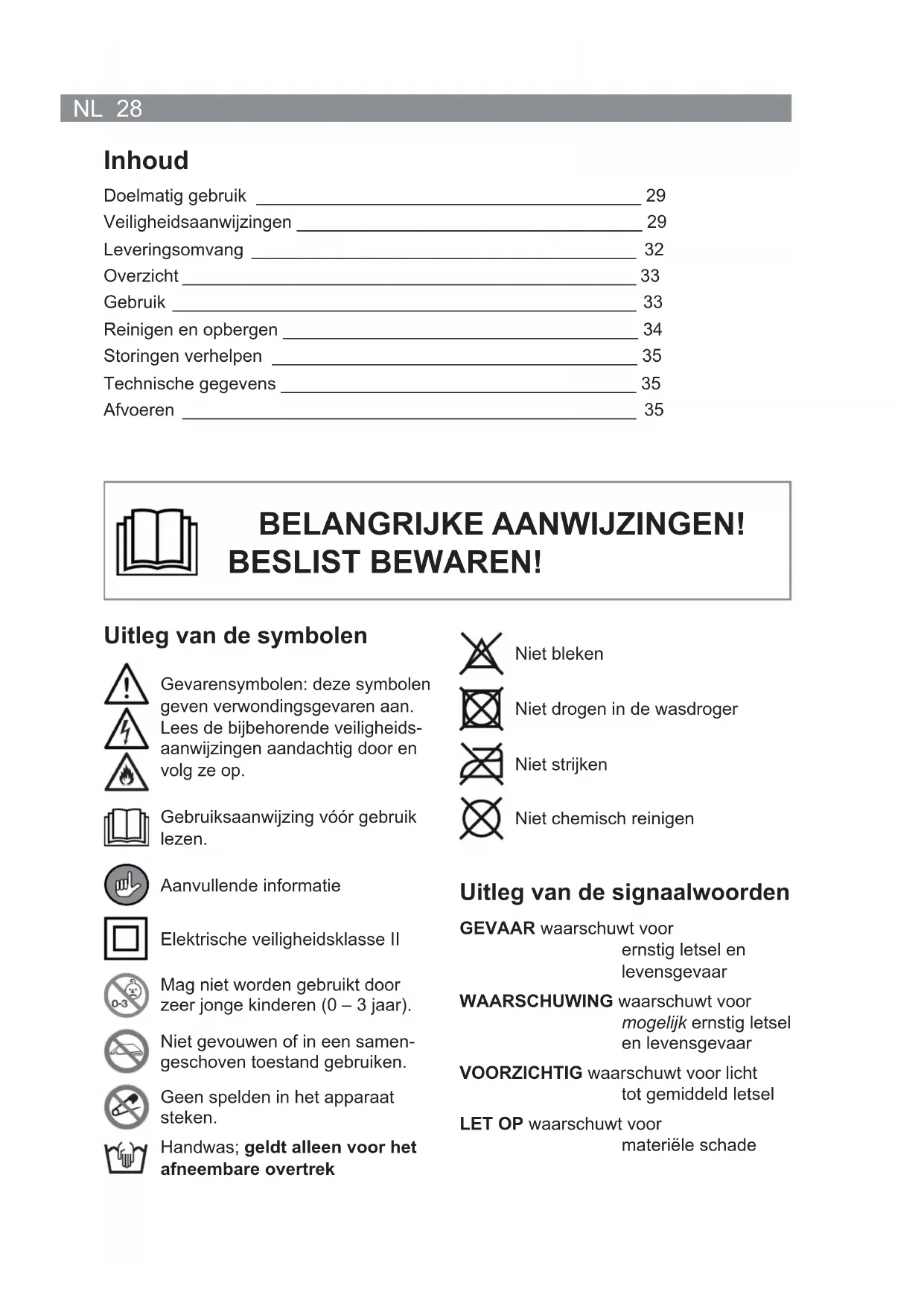 - Alle gebreken die zijn terug te voeren op ondeskundige behandeling, beschadiging of reparatiepogingen, zijn uitgesloten van de garantie. Dit geldt ook voor de normale slijtage. Veiligheidsaanwijzingen ■ Kinderen jonger dan drie jaar mogen dit apparaat niet gebrui- ken, aangezien zij niet in staat zijn, om op oververhitting te re- ageren. ■ Het apparaat mag niet door jonge kinderen in de leeftijd van ou- der dan drie jaar worden gebruikt, tenzij de regel- en / of bestu- ringseenheden door één van de ouders of een toezichthoudend persoon vooraf werd ingesteld of het kind voldoende instructies heeft gekregen hoe het de regel- en / of besturingseenheden op een veilige manier gebruikt. ■ Dit apparaat kan worden gebruikt door kinderen vanaf 8 jaar en door personen met beperkte lichamelijke, sensorische of gees- telijke vermogens of personen die niet beschikken over ervaring en/of kennis, wanneer zij onder toezicht staan en instructies hebben gekregen hoe het apparaat op een veilige manier kan worden gebruikt en wanneer zij de daarmee gepaard gaande gevaren hebben begrepen. Geachte klant, Wij danken u dat u hebt gekozen voor de aankoop van deze massagewarmtedeken. Lees vóór het eerste gebruik van de warmtedeken deze gebruiksaanwijzing zorg- vuldig door en bewaar deze voor latere vragen en andere gebruikers. Deze is een bestanddeel van het apparaat. Fabrikant en importeur aanvaarden geen aansprakelijkheid wanneer de informatie in deze gebruiksaanwijzing niet in acht wordt genomen. Neem bij vragen over het apparaat en over reserveonderdelen / toebehoren via onze website contact op met de klantenservice: www.service-shopping.deNL 30 ■ Kinderen mogen niet met het apparaat spelen. ■ Reiniging en gebruikersonderhoud mogen niet worden uitge- voerd door kinderen, tenzij zij ouder zijn dan 8 jaar en onder toezicht staan. ■ Het apparaat mag niet worden gebruikt door personen die on- gevoelig zijn voor hitte en niet door andere bescherming behoe- vende personen die niet op oververhitting kunnen reageren. ■ Het apparaat is niet bedoeld voor gebruik in ziekenhuizen. ■ Het apparaat niet gebruiken, wanneer de overtrek nat of vochtig is. Het moet vóór de ingebruikname volledig droog zijn. ■ Er mogen geen veiligheidspelden of andere puntige of scherpe voorwerpen op het apparaat worden aangebracht of erin wor- den gestoken. ■ Schakel de massagewarmtedeken niet in wanneer het is sa- mengevouwen. Het moet vóór gebruik altijd worden uitgespreid, om warmtestuwing te voorkomen. ■ Controleer het apparaat en de toebehoren vóór elke ingebruik- name op beschadigingen of slijtage. Het mag alleen worden ge- bruikt, wanneer het onbeschadigd is en geen slijtage vertoont. ■ Voer geen veranderingen uit aan het apparaat. ■ Wanneer het apparaat of zijn aansluitsnoer zijn beschadigd, dan moeten deze onderdelen door de fabrikant, de klantenservice of een soortgelijk gekwalifi ceerde persoon (bijv. gespecialiseerde werkplaats) worden vervangen, om gevaren te voorkomen. ■ Het apparaat is niet bedoeld om te worden ingezet in combina- tie met een externe tijdschakelaar of een apart afstandsbedie- ningssysteem. ■ De stroomtoevoer naar het apparaat moet worden onderbroken als het niet onder toezicht staat en voordat het wordt gereinigd. ■ De massagewarmtedeken altijd volledig laten afkoelen voordat het wordt samengevouwen en / of opgeborgen. ■ De massagewarmtedeken losjes samenvouwen, niet sterk sa- mendrukken of buigen, zodat de verwarmingsspiralen niet wor- den beschadigd. Geen voorwerpen, dieren of personen op de gevouwen warmtemassagedeken plaatsen.31 NL GEVAAR – Gevaar voor een elektrische schok ■ Het apparaat uitsluitend gebruiken en bewaren in gesloten ruimten. Gebruik het niet in de openlucht of in ruimten met een hoge luchtvochtigheid. ■ Raak het aansluitsnoer nooit aan met vochtige handen wanneer het is aangesloten op het stroomnet. ■ Het apparaat (met uitzondering van de overtrek) en het aansluitsnoer nooit in water of andere vloeistoffen dompelen en beschermen tegen natheid of vocht. ■ Onderbreek onmiddellijk de stroomtoevoer als het apparaat in het water valt. Probeer niet om het apparaat uit het water te trekken, terwijl het is aangesloten op het stroom- net! In een gespecialiseerde werkplaats laten controleren alvorens het opnieuw in gebruik te nemen. WAARSCHUWING – Brandgevaar ■ Gebruik het apparaat niet in ruimten waarin zich licht ontvlambare of explosieve sub- stanties bevinden. Gebruik het apparaat nooit in de buurt van een gasbron. ■ Het apparaat en toebehoren uit de buurt houden van vuur of andere warmtebronnen. ■ Bij brand: blus niet met water! Doof vlammen met een blusdeken of een geschikte brandblusser. WAARSCHUWING – Gevaar voor letsel ■ Gevaar door wurging! Zorg ervoor dat het aansluitsnoer steeds buiten bereik is van kleine kinderen en dieren. ■ Valgevaar! Erop letten dat het aansluitsnoer geen gevaar oplevert voor struikelen. ■ Het apparaat alleen gebruiken, wanneer er geen sprake is van fysieke aandoe- ningen of klachten! Als u onzeker bent of het apparaat mag worden gebruikt, met een arts overleg voeren. ■ Het apparaat bevat magneten, die geïmplanteerde alsook medische apparaten, bijv. pacemakers, geïmplanteerde defi brillatoren (ICD), insulinepompen, zouden kunnen verstoren. Desbetreffende personen moeten vóór gebruik van het apparaat hun arts raadplegen of het artikel de werking van hun medisch apparaat kan beïnvloeden. ■ Zwangere vrouwen of vrouwen die kort geleden hebben gebaard mogen het appa- raat niet resp. alleen gebruiken na overleg met hun arts. ■ Zuigelingen en slapende of bewusteloze personen mogen niet op het apparaat wor- den gelegd. ■ Gebruik het apparaat niet in de buurt van resp. op verwondingen, zwellingen, hui- dirritaties, ontstoken huid, wratten, schimmelinfecties, een op een ziekte duidende verandering van de huid of gevoelloze lichaamsdelen. ■ Het apparaat direct uitschakelen, wanneer u tijdens het