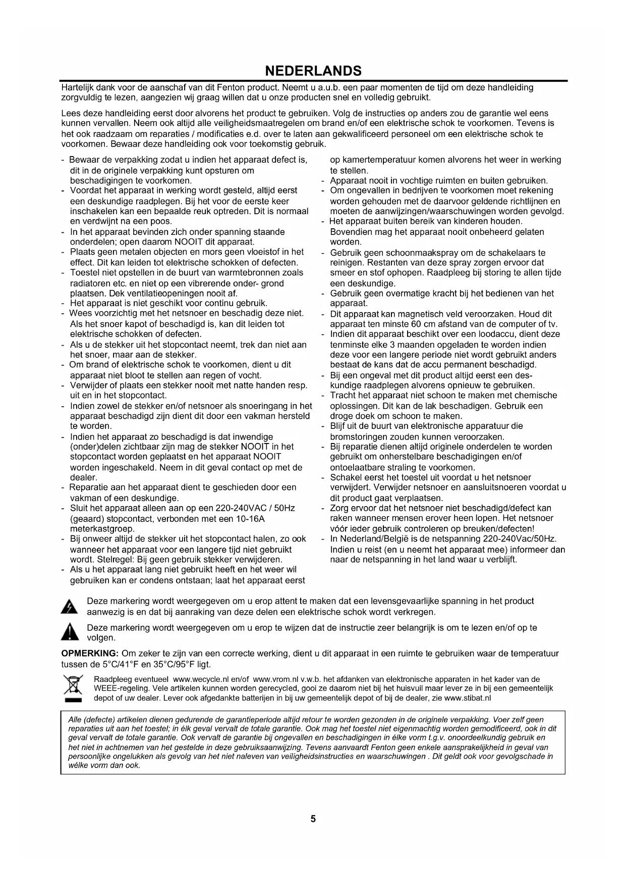 If password is required, you can enter "0000". Attention: The BT distance is approx. 10 meter without any barrier.5 NEDERLANDS Hartelijk dank voor de aanschaf van dit Fenton product. Neemt u a.u.b. een paar momenten de tijd om deze handleiding zorgvuldig te lezen, aangezien wij graag willen dat u onze producten snel en volledig gebruikt. Lees deze handleiding eerst door alvorens het product te gebruiken. Volg de instructies op anders zou de garantie wel eens kunnen vervallen. Neem ook altijd alle veiligheidsmaatregelen om brand en/of een elektrische schok te voorkomen. Tevens is het ook raadzaam om reparaties / modificaties e.d. over te laten aan gekwalificeerd personeel om een elektrische schok te voorkomen. Bewaar deze handleiding ook voor toekomstig gebruik. - Bewaar de verpakking zodat u indien het apparaat defect is, dit in de originele verpakking kunt opsturen om beschadigingen te voorkomen. - Voordat het apparaat in werking wordt gesteld, altijd eerst een deskundige raadplegen. Bij het voor de eerste keer inschakelen kan een bepaalde reuk optreden. Dit is normaal en verdwijnt na een poos. - In het apparaat bevinden zich onder spanning staande onderdelen; open daarom NOOIT dit apparaat. - Plaats geen metalen objecten en mors geen vloeistof in het effect. Dit kan leiden tot elektrische schokken of defecten. - Toestel niet opstellen in de buurt van warmtebronnen zoals radiatoren etc. en niet op een vibrerende onder- grond plaatsen. Dek ventilatieopeningen nooit af. - Het apparaat is niet geschikt voor continu gebruik. - Wees voorzichtig met het netsnoer en beschadig deze niet. Als het snoer kapot of beschadigd is, kan dit leiden tot elektrische schokken of defecten. - Als u de stekker uit het stopcontact neemt, trek dan niet aan het snoer, maar aan de stekker. - Om brand of elektrische schok te voorkomen, dient u dit apparaat niet bloot te stellen aan regen of vocht. - Verwijder of plaats een stekker nooit met natte handen resp. uit en in het stopcontact. - Indien zowel de stekker en/of netsnoer als snoeringang in het apparaat beschadigd zijn dient dit door een vakman hersteld te worden. - Indien het apparaat zo beschadigd is dat inwendige (onder)delen zichtbaar zijn mag de stekker NOOIT in het stopcontact worden geplaatst en het apparaat NOOIT worden ingeschakeld. Neem in dit geval contact op met de dealer. - Reparatie aan het apparaat dient te geschieden door een vakman of een deskundige. - Sluit het apparaat alleen aan op een 220-240VAC / 50Hz (geaard) stopcontact, verbonden met een 10-16A meterkastgroep. - Bij onweer altijd de stekker uit het stopcontact halen, zo ook wanneer het apparaat voor een langere tijd niet gebruikt wordt. Stelregel: Bij geen gebruik stekker verwijderen. - Als u het apparaat lang niet gebruikt heeft en het weer wil gebruiken kan er condens ontstaan; laat het apparaat eerst op kamertemperatuur komen alvorens het weer in werking te stellen. - Apparaat nooit in vochtige ruimten en buiten gebruiken. - Om ongevallen in bedrijven te voorkomen moet rekening worden gehouden met de daarvoor geldende richtlijnen en moeten de aanwijzingen/waarschuwingen worden gevolgd. - Het apparaat buiten bereik van kinderen houden. Bovendien mag het apparaat nooit onbeheerd gelaten worden. - Gebruik geen schoonmaakspray om de schakelaars te reinigen. Restanten van deze spray zorgen ervoor dat smeer en stof ophopen. Raadpleeg bij storing te allen tijde een deskundige. - Gebruik geen overmatige kracht bij het bedienen van het apparaat. - Dit apparaat kan magnetisch veld veroorzaken. Houd dit apparaat ten minste 60 cm afstand van de computer of tv. - Indien dit apparaat beschikt over een loodaccu, dient deze tenminste elke 3 maanden opgeladen te worden indien deze voor een langere periode niet wordt gebruikt anders bestaat de kans dat de accu permanent beschadigd. - Bij een ongeval met dit product altijd eerst een des- kundige raadplegen alvorens opnieuw te gebruiken. - Tracht het apparaat niet schoon te maken met chemische oplossingen. Dit kan de lak beschadigen. Gebruik een droge doek om schoon te maken. - Blijf uit de buurt van elektronische apparatuur die bromstoringen zouden kunnen veroorzaken. - Bij reparatie dienen altijd originele onderdelen te worden gebruikt om onherstelbare beschadigingen en/of ontoelaatbare straling te voorkomen. - Schakel eerst het toestel uit voordat u het netsnoer verwijdert. Verwijder netsnoer en aansluitsnoeren voordat u dit product gaat verplaatsen. - Zorg ervoor dat het netsnoer niet beschadigd/defect kan raken wanneer mensen erover heen lopen. Het netsnoer vóór ieder gebruik controleren op breuken/defecten! - In Nederland/België is de netspanning 220-240Vac/50Hz. Indien u reist (en u neemt het apparaat mee) informeer dan naar de netspanning in het land waar u verblijft.