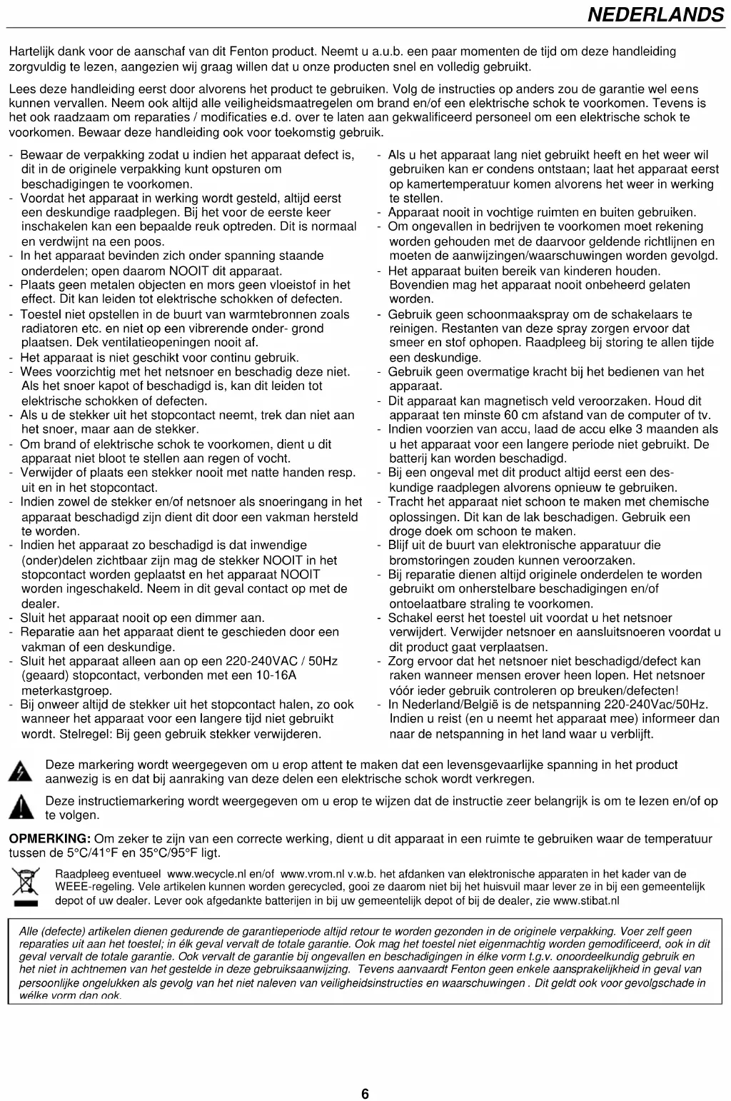 Alle (defecte) artikelen dienen gedurende de garantieperiode altijd retour te worden gezonden in de originele verpakking. Voer zelf geen reparaties uit aan het toestel; in élk geval vervalt de totale garantie. Ook mag het toestel niet eigenmachtig worden gemodificeerd, ook in dit geval vervalt de totale garantie. Ook vervalt de garantie bij ongevallen en beschadigingen in élke vorm t.g.v. onoordeelkundig gebruik en het niet in achtnemen van het gestelde in deze gebruiksaanwijzing. Tevens aanvaardt Fenton geen enkele aansprakelijkheid in geval van persoonlijke ongelukken als gevolg van het niet naleven van veiligheidsinstructies en waarschuwingen . Dit geldt ook voor gevolgschade in wélke vorm dan ook.7 OVERZICHT