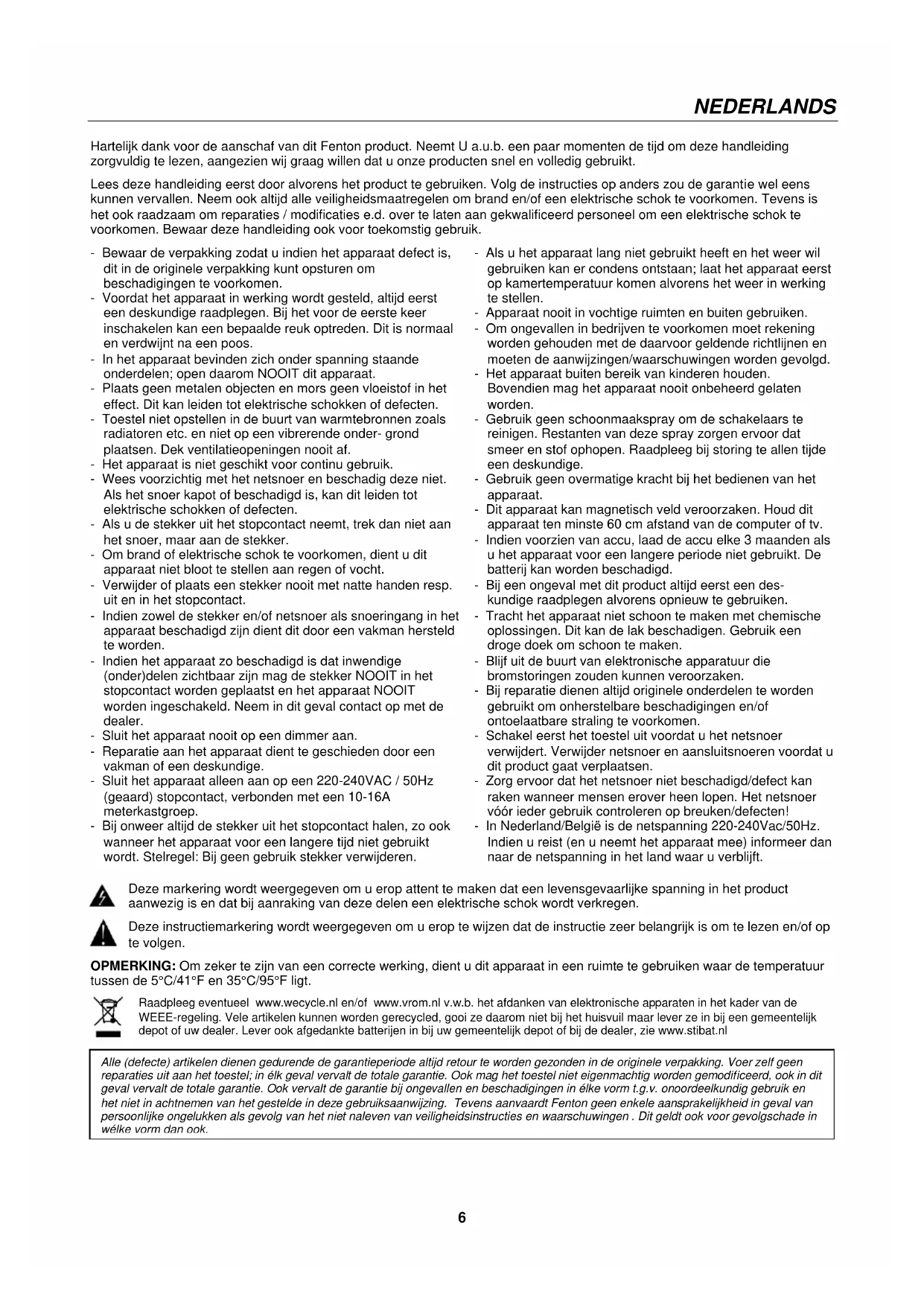 Alle (defecte) artikelen dienen gedurende de garantieperiode altijd retour te worden gezonden in de originele verpakking. Voer zelf geen reparaties uit aan het toestel; in élk geval vervalt de totale garantie. Ook mag het toestel niet eigenmachtig worden gemodificeerd, ook in dit geval vervalt de totale garantie. Ook vervalt de garantie bij ongevallen en beschadigingen in élke vorm t.g.v. onoordeelkundig gebruik en het niet in achtnemen van het gestelde in deze gebruiksaanwijzing. Tevens aanvaardt Fenton geen enkele aansprakelijkheid in geval van persoonlijke ongelukken als gevolg van het niet naleven van veiligheidsinstructies en waarschuwingen . Dit geldt ook voor gevolgschade in wélke vorm dan ook.7