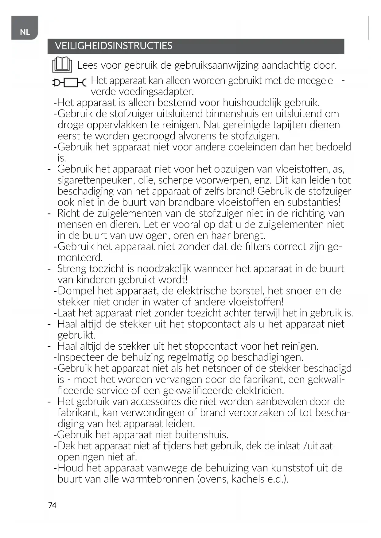 Gebruik het apparaat niet voor andere doeleinden dan het bedoeld is. - Gebruik het apparaat niet voor het opzuigen van vloeistoen, as, sigareenpeuken, olie, scherpe voorwerpen, enz. Dit kan leiden tot beschadiging van het apparaat of zelfs brand! Gebruik de stofzuiger ook niet in de buurt van brandbare vloeistoen en substanes! - Richt de zuigelementen van de stofzuiger niet in de richng van mensen en dieren. Let er vooral op dat u de zuigelementen niet in de buurt van uw ogen, oren en haar brengt.