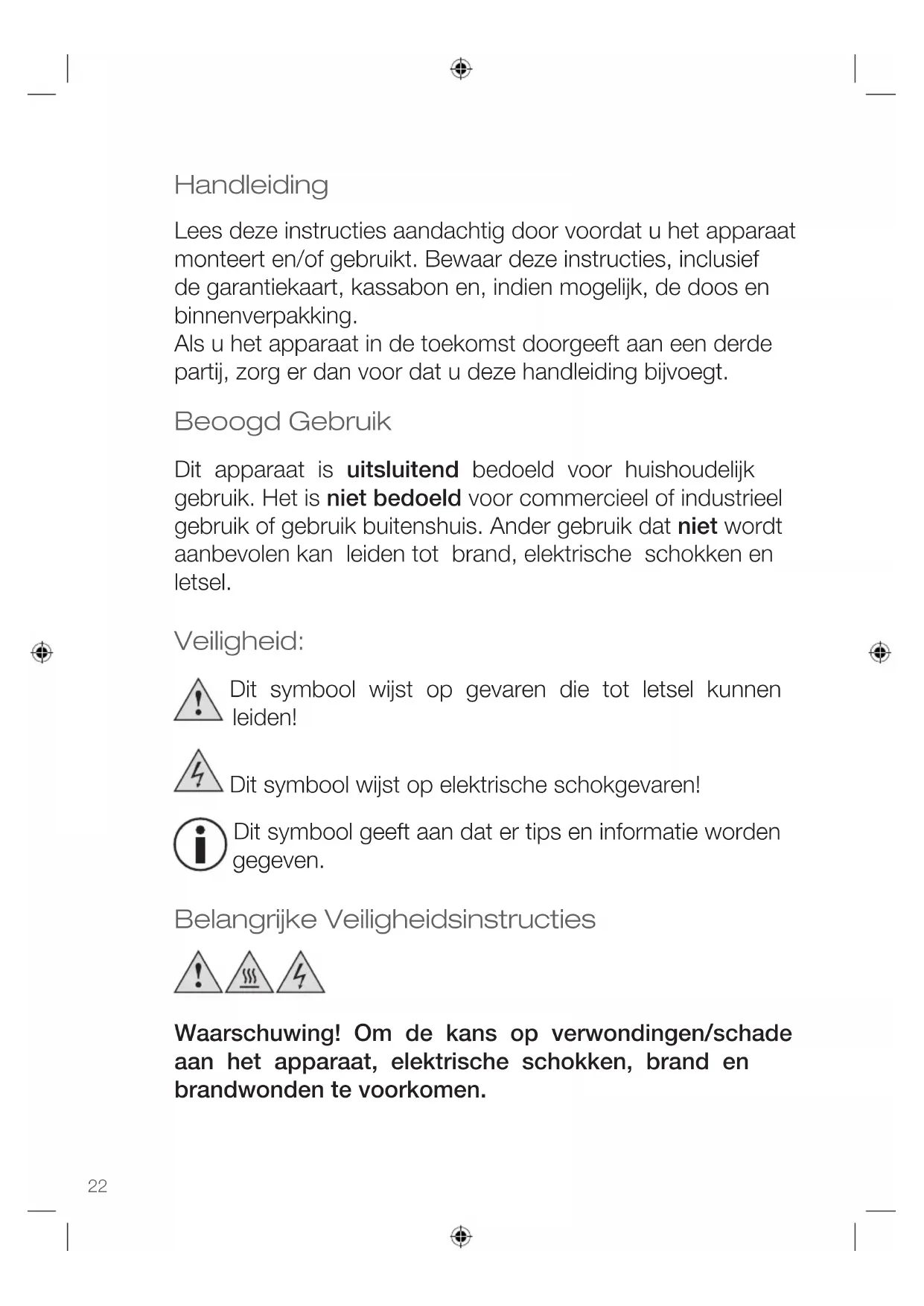 - fordamagescausedbyowner This guarantee does not affect your statutory right, nor any legal right you may have as a custumer under applicable national legislation governing the purchase of goods. In order to assert his/her right in a guarantee case during the guaranteed period, the customer must provide evidence of the date of purchase (receipt). The guarantee is to be asserted against KORONA electric GmbH, Sundern/Germany. Telephone Hotline: +49 2933 90284-80 Mail: service@korona-electric.de web: www.korona-electric.de within 2 years after the date of purchase. In case of guarantee the customer is given the right to get the appliance repaired at our own or at an authorized shop. Further rights (due to guarantee case) are not given to the customer.22 Handleiding Lees deze instructies aandachtig door voordat u het apparaat monteert en/of gebruikt. Bewaar deze instructies, inclusief de garantiekaart, kassabon en, indien mogelijk, de doos en binnenverpakking. Als u het apparaat in de toekomst doorgeeft aan een derde partij, zorg er dan voor dat u deze handleiding bijvoegt. Beoogd Gebruik Dit apparaat is uitsluitend bedoeld voor huishoudelijk gebruik. Het is niet bedoeld voor commercieel of industrieel gebruik of gebruik buitenshuis. Ander gebruik dat niet wordt aanbevolen kan leiden tot brand, elektrische schokken en letsel. Veiligheid: Dit symbool wijst op gevaren die tot letsel kunnen leiden! Dit symbool wijst op elektrische schokgevaren! Dit symbool geeft aan dat er tips en informatie worden gegeven. Belangrijke Veiligheidsinstructies Waarschuwing! Om de kans op verwondingen/schade aan het apparaat, elektrische schokken, brand en brandwonden te voorkomen.NEDERLANDS Handleiding