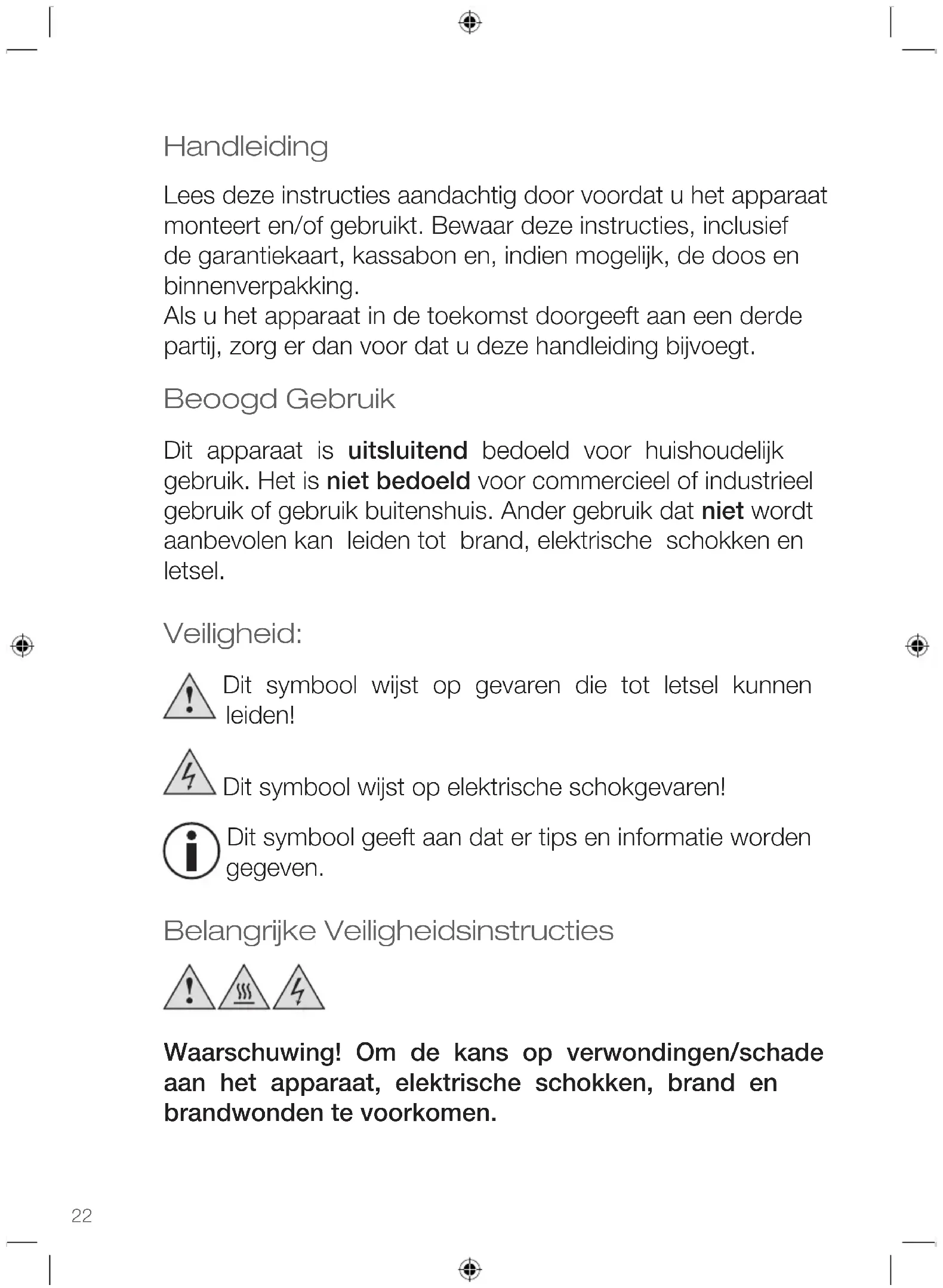 - fordamagescausedbyowner This guarantee does not affect your statutory right, nor any legal right you may have as a custumer under applicable national legislation governing the purchase of goods. In order to assert his/her right in a guarantee case during the guaranteed period, the customer must provide evidence of the date of purchase (receipt). The guarantee is to be asserted against KORONA electric GmbH, Sundern/Germany. Telephone Hotline: +49 2933 90284-80 Mail: service@korona-electric.de web: www.korona-electric.de within 2 years after the date of purchase. In case of guarantee the customer is given the right to get the appliance repaired at our own or at an authorized shop. Further rights (due to guarantee case) are not given to the customer.22 Handleiding Lees deze instructies aandachtig door voordat u het apparaat monteert en/of gebruikt. Bewaar deze instructies, inclusief de garantiekaart, kassabon en, indien mogelijk, de doos en binnenverpakking. Als u het apparaat in de toekomst doorgeeft aan een derde partij, zorg er dan voor dat u deze handleiding bijvoegt. Beoogd Gebruik Dit apparaat is uitsluitend bedoeld voor huishoudelijk gebruik. Het is niet bedoeld voor commercieel of industrieel gebruik of gebruik buitenshuis. Ander gebruik dat niet wordt aanbevolen kan leiden tot brand, elektrische schokken en letsel. Veiligheid: Dit symbool wijst op gevaren die tot letsel kunnen leiden! Dit symbool wijst op elektrische schokgevaren! Dit symbool geeft aan dat er tips en informatie worden gegeven. Belangrijke Veiligheidsinstructies Waarschuwing! Om de kans op verwondingen/schade aan het apparaat, elektrische schokken, brand en brandwonden te voorkomen.NEDERLANDS Handleiding