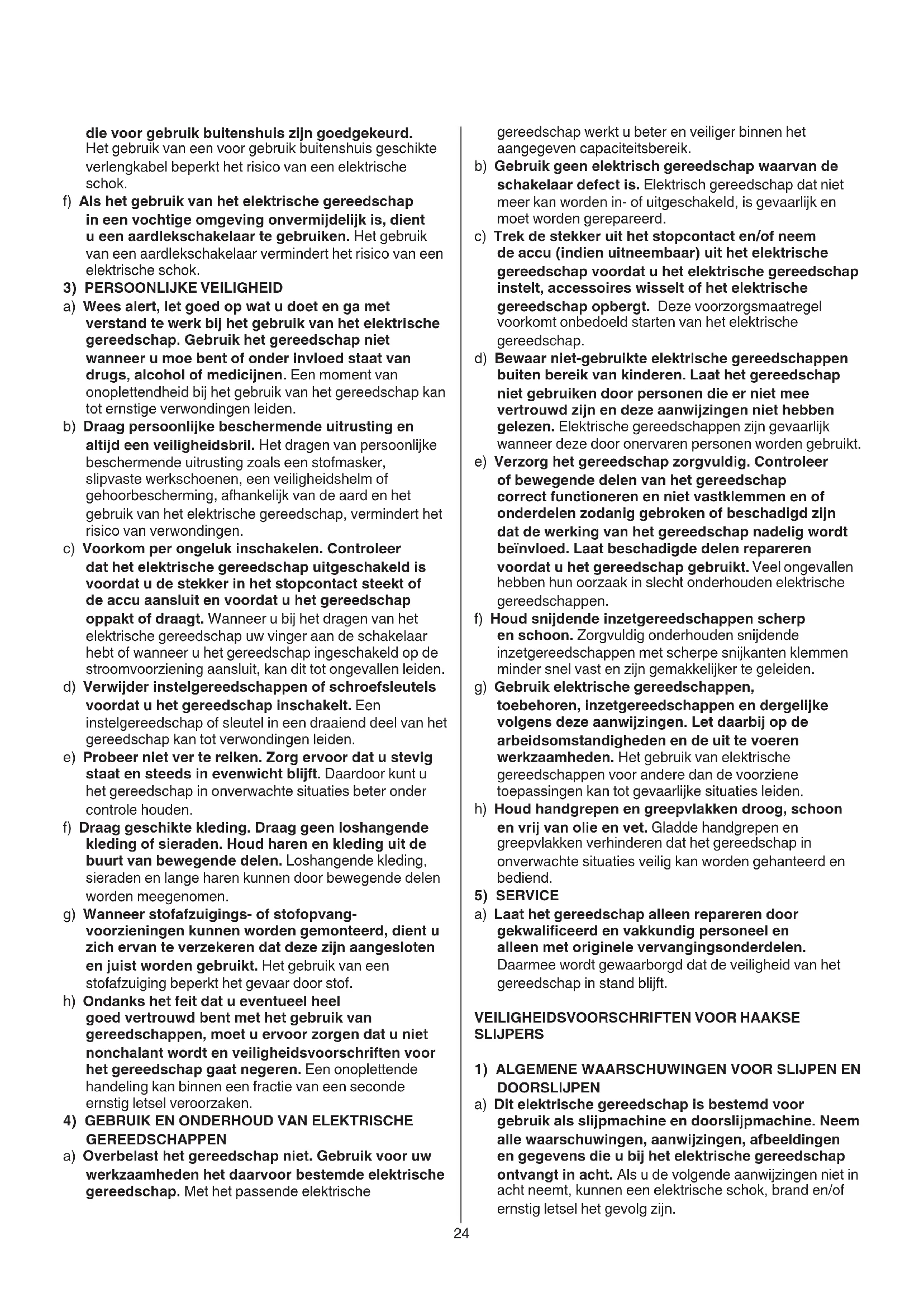 a) Wees alert, let goed op wat u doet en ga met verstand te werk bij het gebruik van het elektrische gereedschap. Gebruik het gereedschap niet wanneer u moe bent of onder invloed staat van drugs, alcohol of medicijnen. Een moment van onoplettendheid bij het gebruik van het gereedschap kan tot ernstige verwondingen leiden. b) Draag persoonlijke beschermende uitrusting en altijd een veiligheidsbril. Het dragen van persoonlijke beschermende uitrusting zoals een stofmasker, slipvaste werkschoenen, een veiligheidshelm of gehoorbescherming, afhankelijk van de aard en het gebruik van het elektrische gereedschap, vermindert het risico van verwondingen. c) Voorkom per ongeluk inschakelen. Controleer dat het elektrische gereedschap uitgeschakeld is voordat u de stekker in het stopcontact steekt of de accu aansluit en voordat u het gereedschap oppakt of draagt. Wanneer u bij het dragen van het elektrische gereedschap uw vinger aan de schakelaar hebt of wanneer u het gereedschap ingeschakeld op de stroomvoorziening aansluit, kan dit tot ongevallen leiden. d) Verwijder instelgereedschappen of schroefsleutels voordat u het gereedschap inschakelt. Een instelgereedschap of sleutel in een draaiend deel van het gereedschap kan tot verwondingen leiden. e) Probeer niet ver te reiken. Zorg ervoor dat u stevig staat en steeds in evenwicht blijft. Daardoor kunt u het gereedschap in onverwachte situaties beter onder controle houden. f) Draag geschikte kleding. Draag geen loshangende kleding of sieraden. Houd haren en kleding uit de buurt van bewegende delen. Loshangende kleding, sieraden en lange haren kunnen door bewegende delen worden meegenomen. g) Wanneer stofafzuigings- of stofopvang- voorzieningen kunnen worden gemonteerd, dient u zich ervan te verzekeren dat deze zijn aangesloten en juist worden gebruikt. Het gebruik van een stofafzuiging beperkt het gevaar door stof. h) Ondanks het feit dat u eventueel heel goed vertrouwd bent met het gebruik van gereedschappen, moet u ervoor zorgen dat u niet nonchalant wordt en veiligheidsvoorschriften voor het gereedschap gaat negeren. Een onoplettende handeling kan binnen een fractie van een seconde ernstig letsel veroorzaken.