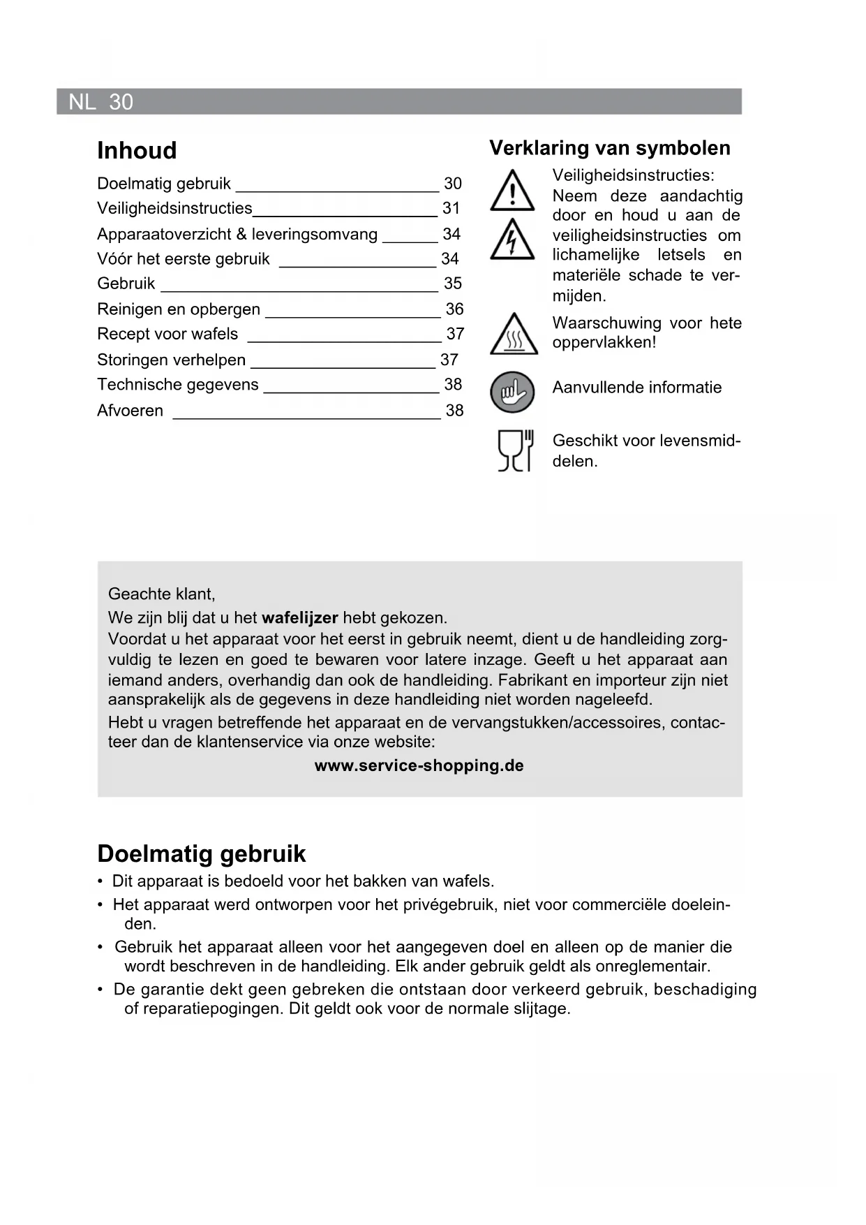 - De garantie dekt geen gebreken die ontstaan door verkeerd gebruik, beschadiging of reparatiepogingen. Dit geldt ook voor de normale slijtage. Inhoud Doelmatig gebruik ______________________ 30 Veiligheidsinstructies____________________ 31 Apparaatoverzicht & leveringsomvang ______ 34 Vóór het eerste gebruik _________________ 34 Gebruik ______________________________ 35 Reinigen en opbergen ___________________ 36 Recept voor wafels _____________________ 37 Storingen verhelpen ____________________ 37 Technische gegevens ___________________ 38 Afvoeren _____________________________ 38 Verklaring van symbolen Veiligheidsinstructies: Neem deze aandachtig door en houd u aan de veiligheidsinstructies om lichamelijke letsels en materiële schade te ver- mijden. Waarschuwing voor hete oppervlakken! Aanvullende informatie Geschikt voor levensmid- delen. Geachte klant, We zijn blij dat u het wafelijzer hebt gekozen. Voordat u het apparaat voor het eerst in gebruik neemt, dient u de handleiding zorg- vuldig te lezen en goed te bewaren voor latere inzage. Geeft u het apparaat aan iemand anders, overhandig dan ook de handleiding. Fabrikant en importeur zijn niet aansprakelijk als de gegevens in deze handleiding niet worden nageleefd. Hebt u vragen betreffende het apparaat en de vervangstukken/accessoires, contac- teer dan de klantenservice via onze website: www.service-shopping.de31 NL Veiligheidsinstructies ■ Dit apparaat kan worden gebruikt door kinderen vanaf 8 jaar alsook door personen met beperkte lichamelijke, sensorische of geestelijke vermogens of kinderen die niet beschikken over er- varing en/of kennis, wanneer zij onder toezicht staan en instruc- ties hebben gekregen over hoe het apparaat op veilige wijze kan worden gebruikt en wanneer zij de daaruit voortvloeiende gevaren hebben begrepen. ■ Kinderen mogen niet met het apparaat spelen. ■ Reiniging en gebruikersonderhoud mogen niet worden uitge- voerd door kinderen, tenzij zij ouder zijn dan 8 jaar en onder toezicht staan. ■ Kinderen jonger dan 8 jaar en dieren moeten uit de buurt worden gehouden van het apparaat en het netsnoer