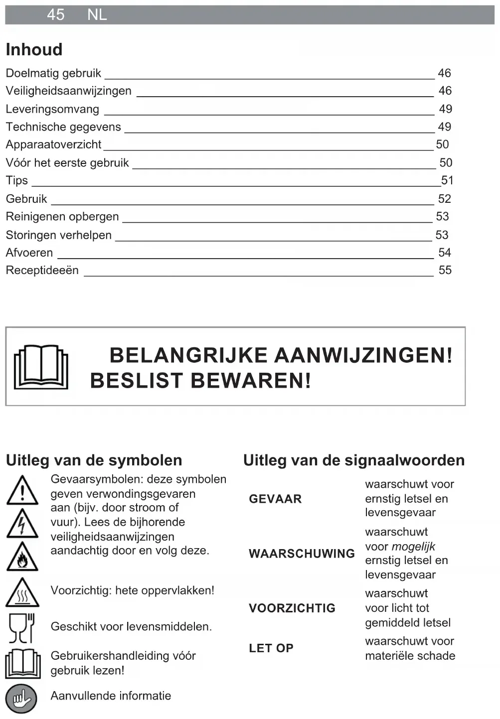 de 5 à 10 minutes le cas échéant si les chaussons paraissent trop pâles.45 NL Inhoud Doelmatig gebruik __________________________________________________ 46 Veiligheidsaanwijzingen _____________________________________________ 46 Leveringsomvang __________________________________________________ 49 Technische gegevens _______________________________________________ 49 Apparaatoverzicht __________________________________________________ 50 Vóór het eerste gebruik ______________________________________________ 50 Tips ______________________________________________________________51 Gebruik __________________________________________________________ 52 Reinigenen opbergen _______________________________________________ 53 Storingen verhelpen ________________________________________________ 53 Afvoeren _________________________________________________________ 54 Receptideeën _____________________________________________________ 55 Uitleg van de symbolen Gevaarsymbolen: deze symbolen geven verwondingsgevaren aan (bijv. door stroom of vuur). Lees de bijhorende veiligheidsaanwijzingen aandachtig door en volg deze. Voorzichtig: hete oppervlakken! Geschikt voor levensmiddelen. Gebruikershandleiding vóór gebruik lezen! Aanvullende informatie Uitleg van de signaalwoorden GEVAAR waarschuwt voor ernstig letsel en levensgevaar WAARSCHUWING waarschuwt voor mogelijk ernstig letsel en levensgevaar VOORZICHTIG waarschuwt voor licht tot gemiddeld letsel LET OP waarschuwt voor materiële schade BELANGRIJKE AANWIJZINGEN!