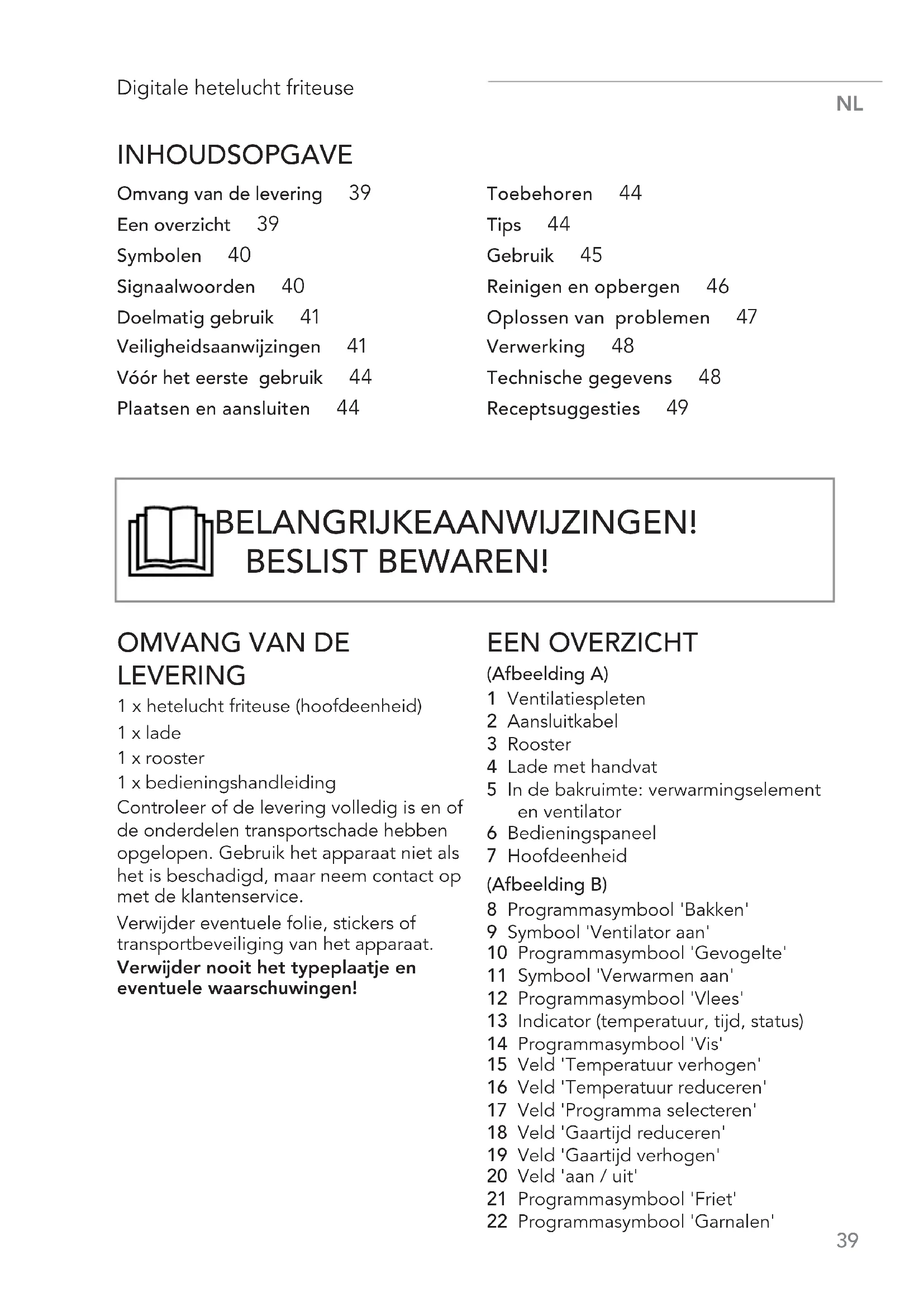 INHOUDSOPGAVE Omvang van de levering 39 Een overzicht 39 Symbolen 40 Signaalwoorden 40 Doelmatig gebruik 41 Veiligheidsaanwijzingen 41 Vóór het eerste gebruik 44 Plaatsen en aansluiten 44 Toebehoren 44 Tips 44 Gebruik 45 Reinigen en opbergen 46 Oplossen van problemen 47 Verwerking 48 Technische gegevens 48 Receptsuggesties 49