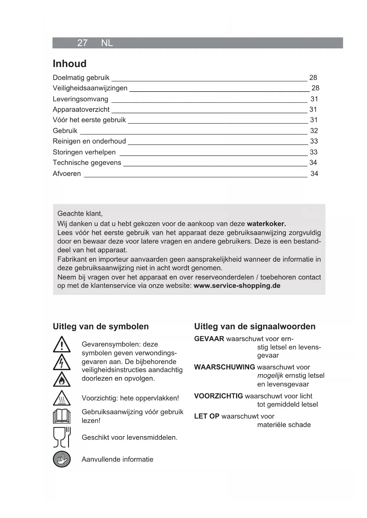 - Alle gebreken die ontstaan door ondeskundige behandeling, beschadiging, kalkaan- slag of reparatiepogingen, zijn uitgesloten van de garantie. Dit geldt ook voor de normale slijtage. Veiligheidsaanwijzingen WAARSCHUWING: alle veiligheidsaanwijzingen, aanwij- zingen, afbeeldingen en technische gegevens die zijn aangebracht op dit apparaat, lezen. Nalatigheid bij het na- leven van de veiligheidsinstructies en aanwijzingen kan een elektrische schok, brand en / of letsel tot gevolg hebben. ■ Dit apparaat kan worden gebruikt door kinderen vanaf 8 jaar en door personen met beperkte lichamelijke, sensorische of gees- telijke vermogens of personen die niet beschikken over ervaring en / of kennis, wanneer zij onder toezicht staan en instructies hebben gekregen hoe het apparaat op een veilige manier kan worden gebruikt en wanneer zij de daarmee gepaard gaande gevaren hebben begrepen. ■ Kinderen mogen niet met het apparaat spelen. ■ Reiniging en gebruikersonderhoud mogen niet worden uitge- voerd door kinderen, tenzij zij ouder zijn dan 8 jaar en onder toezicht staan. ■ Kinderen jonger dan 8 jaar en dieren moeten uit de buurt wor- den gehouden van het apparaat en het aansluitsnoer. VOORZICHTIG: hete oppervlakken! De waterkoker wordt tijdens het gebruik zeer heet. Tij- dens en na gebruik van de waterkoker niet in aan- raking komen met opgewarmde delen! Uitsluitend de greep aanraken, wanneer de waterkoker in bedrijf is of heet water bevat. ■ De stroomtoevoer naar het basisstation moet altijd worden on- derbroken als het niet onder toezicht staat en voordat het wordt gereinigd.29 NL ■ Dompel de waterkoker, het basisstation, en het aansluitsnoer nooit in water of andere vloeistoffen en zorg ervoor dat deze niet in het water kunnen vallen. ■ Gebruik de waterkoker uitsluitend met het bijgeleverde basis- station. Gebruik het basisstation niet met andere apparaten. ■ Nooit verder gaan dan de maximale vulhoeveelheid (let op de MAX-markering op de waterstandindicatie!). Is de waterkoker te vol, zou er kokend water uit de schenktuit kunnen lekken. ■ Geen veranderingen aanbrengen aan het apparaat. Ook het netsnoer niet zelf vervangen. Wanneer de waterkoker, het ba- sisstation of het aansluitsnoer zijn beschadigd, moeten deze door de fabrikant, klantenservice of een professionele werk- plaats worden vervangen om gevaren te voorkomen. ■ Het apparaat is niet bedoeld om te worden ingezet in combina- tie met een externe tijdschakelaar of een apart afstandsbedie- ningssysteem. ■ De reinigingsinstructies in het hoofdstuk "Reinigen en onder- houd" in acht nemen! GEVAAR – Gevaar voor een elektrische schok ■ Het apparaat uitsluitend gebruiken en bewaren in gesloten ruimten. Het apparaat niet gebruiken in ruimten met een hoge luchtvochtigheid. ■ Als het basisstation in het water valt, onderbreekt u meteen de stroomtoevoer. Pro- beer niet om het uit het water te trekken, wanneer het is aangesloten op het stroom- net! Laat het basisstation en de waterkoker in een professionele werkplaats controle- ren, alvorens deze opnieuw in gebruik te nemen. ■ Raak het basisstation en het aansluitsnoer nooit aan met vochtige handen als deze onderdelen zijn aangesloten op het stroomnet. ■ Neem de waterkoker voor het vullen, leeggieten of reinigen van het basisstation. Let erop dat er geen water in de contacten aan de onderzijde van de waterkoker binnendringt. WAARSCHUWING – Brandgevaar ■ Gebruik het apparaat niet in ruimten waarin zich licht ontvlambare of explosieve sub- stanties bevinden. ■ Het apparaat niet gebruiken in de buurt van brandbaar materiaal. Leg geen brandba- re materialen (bijv. karton, papier, kunststof) op of in het apparaat. ■ Sluit het apparaat niet samen met andere apparaten (met een hoog stroomverbruik) aan op een meervoudige contactdoos, om overbelasting en eventueel kortsluiting (brand) te voorkomen.NL 30 ■ Dek het apparaat tijdens de werking niet af, om ontbranden van het apparaat te voor- komen. ■ Bij brand: blus niet met water! Doof vlammen met een blusdeken of een geschikte brandblusser. WAARSCHUWING – Gevaar voor letsel ■ Verstikkingsgevaar! Het verpakkingsmateriaal buiten bereik houden van kinderen en dieren. ■ Gevaar door wurging! Zorg ervoor dat het netsnoer steeds buiten bereik is van kleine kinderen en dieren. ■ Verbrandingsgevaar! – Vermijd contact met de opstijgende stoom uit de schenktuit. Beweeg het deksel niet tijdens het koken. Het apparaat vóór het opnieuw vullen laten afkoelen! – Zorg ervoor dat u kokend water langzaam en voorzichtig uitgiet, zonder dat het apparaat daarbij te snel wordt gekanteld. – Beweeg het apparaat niet tijdens het koken. – Het netsnoer mag niet naar beneden hangen vanaf de standplaats van het apparaat, om te voorkomen dat het apparaat naar beneden wordt getrokken. ■ Valgevaar! Let erop dat niemand kan struikelen over het aangesloten netsnoer. LET OP – Risico op materiële schade ■ Sluit het basisstation alleen aan op een contactdoos met aardingscontacten die is geïnstalleerd volgens de voorschriften. De contactdoos moet ook na het aansluiten goed toegankelijk zijn, zodat de verbinding met het stroomnet snel kan worden ge- isoleerd. De netspanning moet overeenstemmen met de technische gegevens van het basisstation. ■ Gebruik alleen correct werkende verlengsnoeren, waarvan de technische gegevens overeenstemmen met die van het basisstation. ■ Trek in geval van een storing tijdens de werking of vóór een onweersbui de netstek- ker uit de contactdoos. ■ Bescherm het apparaat tegen warmtebronnen, open vuur, temperaturen onder nul, direct zonlicht, lang aanhoudend vocht en schokken. ■ Schakel het apparaat niet in zonder water of met minder water dan tot aan de MIN-markering. Mocht dit toch voorkomen, dan wordt het apparaat automatisch uit- geschakeld. In dit geval het apparaat laten afkoelen, vóórdat er koud water wordt bijgevuld en het apparaat wordt ingeschakeld. ■ De waterkoker laten afkoelen, voo