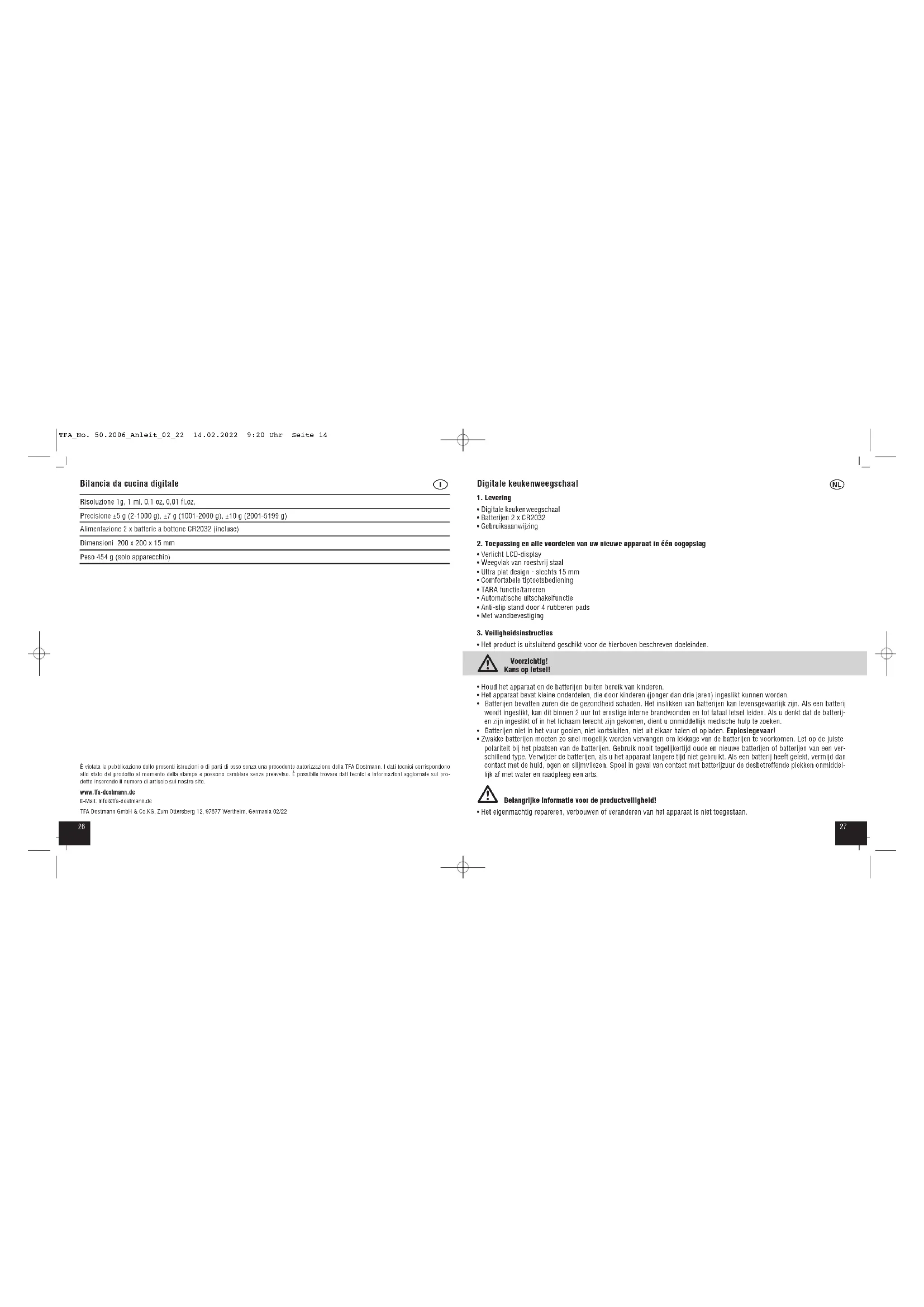 - Het eigenmachtig repareren, verbouwen of veranderen van het apparaat is niet toegestaan. TFA_No. 50.2006_Anleit_02_22 14.02.2022 9:20 Uhr Seite 142928 Digitale keukenweegschaal