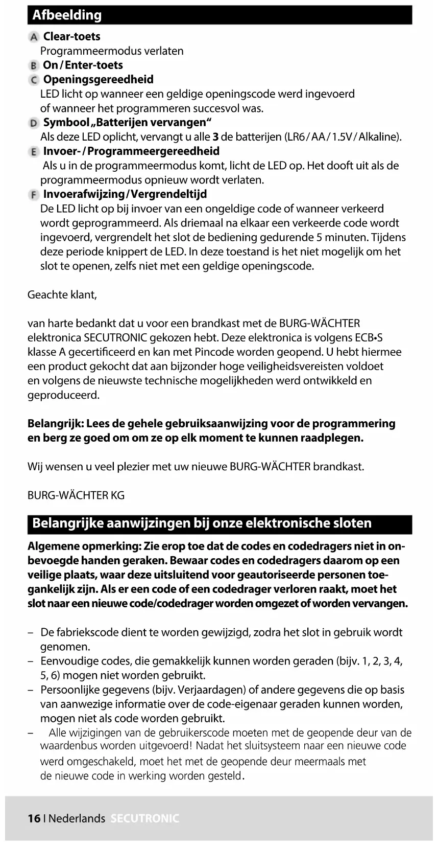 Piles: 3 x 1,5 V Mignon (LR6) Liquidation Cher client, Veuillez aider à éliminer les déchets. Si, à un moment, vous avez l’intention de liquider le dispositif, veuillez considérer que plusieurs parties de ce dispositif sont en matières précieuses qui peuvent être recyclées. Vous êtes priés de ne pas jeter le dispositif avec les ordures ménagères mais de vous renseigner auprès des postes compétents dans votre commune sur les points de ramassage des déchets électriques. Nous rappelons que les équipements électriques et électroniques marqués ainsi et les piles ne doivent pas être collectés avec les ordures ménagères, mais séparément. Veuillez vous renseigner auprès du service compétent de votre ville / commune sur les points de collecte des piles et déchets électroniques. Par la présente, BURG-WÄCHTER KG déclare que cet appareil répond aux directives 2014/30/EU, (EMC), 2011/65/EU (RoHS). Le texte intégral de la déclaration de conformité européenne peut être consulté à l’adresse Internet suivante : www.burg.biz Sous réserves de toutes erreurs ou modications.16 I Nederlands SECUTRONIC Afbeelding Clear-toets Programmeermodus verlaten On / Enter-toets Openingsgereedheid LED licht op wanneer een geldige openingscode werd ingevoerd of wanneer het programmeren succesvol was. Symbool „Batterijen vervangen“ Als deze LED oplicht, vervangt u alle 3 de batterijen (LR6 / AA / 1.5V / Alkaline). Invoer- / Programmeergereedheid Als u in de programmeermodus komt, licht de LED op. Het dooft uit als de programmeermodus opnieuw wordt verlaten. Invoerafwijzing / Vergrendeltijd De LED licht op bij invoer van een ongeldige code of wanneer verkeerd wordt geprogrammeerd. Als driemaal na elkaar een verkeerde code wordt ingevoerd, vergrendelt het slot de bediening gedurende 5 minuten. Tijdens deze periode knippert de LED. In deze toestand is het niet mogelijk om het slot te openen, zelfs niet met een geldige openingscode. Geachte klant, van harte bedankt dat u voor een brandkast met de BURG-WÄCHTER elektronica SECUTRONIC gekozen hebt. Deze elektronica is volgens ECB•S klasse A gecerticeerd en kan met Pincode worden geopend. U hebt hiermee een product gekocht dat aan bijzonder hoge veiligheidsvereisten voldoet en volgens de nieuwste technische mogelijkheden werd ontwikkeld en geproduceerd. Belangrijk: Lees de gehele gebruiksaanwijzing voor de programmering en berg ze goed om om ze op elk moment te kunnen raadplegen. Wij wensen u veel plezier met uw nieuwe BURG-WÄCHTER brandkast.