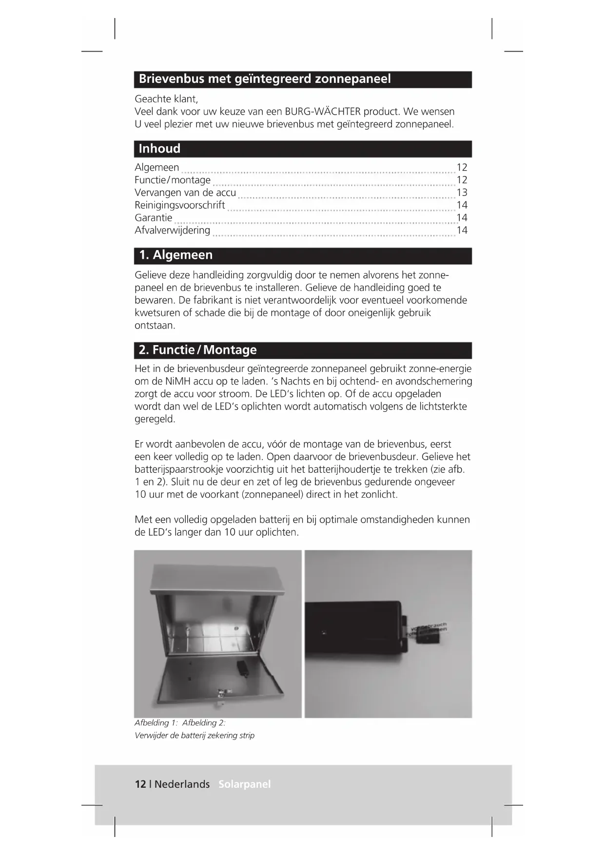 Het in de brievenbusdeur geïntegreerde zonnepaneel gebruikt zonne-energie om de NiMH accu op te laden. ’s Nachts en bij ochtend- en avondschemering zorgt de accu voor stroom. De LED‘s lichten op. Of de accu opgeladen wordt dan wel de LED‘s oplichten wordt automatisch volgens de lichtsterkte geregeld. Er wordt aanbevolen de accu, vóór de montage van de brievenbus, eerst een keer volledig op te laden. Open daarvoor de brievenbusdeur. Gelieve het batterijspaarstrookje voorzichtig uit het batterijhoudertje te trekken (zie afb. 1 en 2). Sluit nu de deur en zet of leg de brievenbus gedurende ongeveer 10 uur met de voorkant (zonnepaneel) direct in het zonlicht. Met een volledig opgeladen batterij en bij optimale omstandigheden kunnen de LED‘s langer dan 10 uur oplichten. Afbelding 1: Afbelding 2: Verwijder de batterij zekering strip12 | Nederlands Solarpanel Solarpanel Nederlands | 13 Montagetip: gelieve er bij de montage op te letten dat het zonnepaneel van de brievenbus zo veel als mogelijk naar de zon gericht is, of dat er zoveel mogelijk licht op de zonnecellen valt. Gelieve de huisnummers, zoals voorgesteld op afbeelding 1, op het paneel te kleven. Voor een optimale hechting mag bij het kleven de temperatuur niet onder 5 °C liggen.