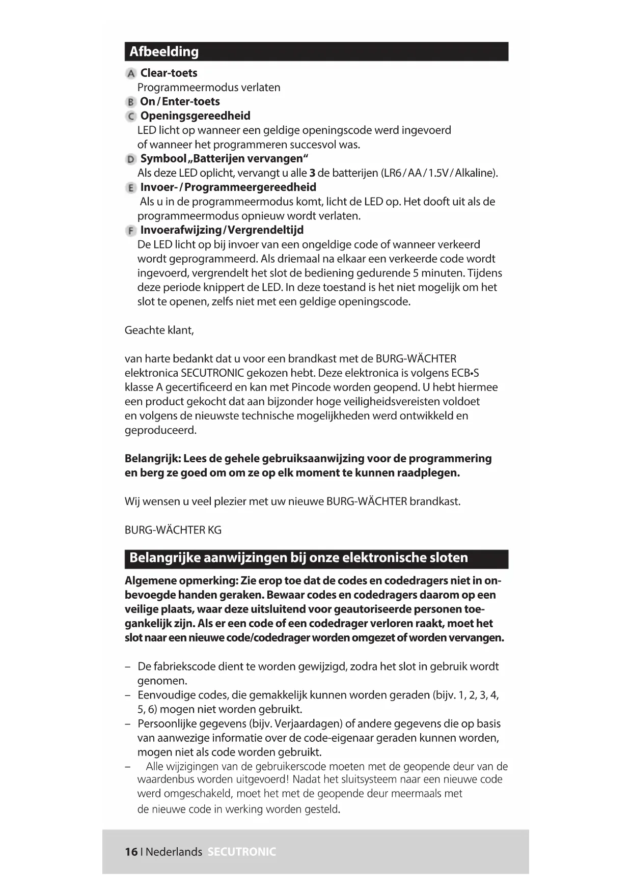 Piles: 3 x 1,5 V Mignon (LR6) Liquidation Cher client, Veuillez aider à éliminer les déchets. Si, à un moment, vous avez l’intention de liquider le dispositif, veuillez considérer que plusieurs parties de ce dispositif sont en matières précieuses qui peuvent être recyclées. Vous êtes priés de ne pas jeter le dispositif avec les ordures ménagères mais de vous renseigner auprès des postes compétents dans votre commune sur les points de ramassage des déchets électriques. Nous rappelons que les équipements électriques et électroniques marqués ainsi et les piles ne doivent pas être collectés avec les ordures ménagères, mais séparément. Veuillez vous renseigner auprès du service compétent de votre ville / commune sur les points de collecte des piles et déchets électroniques. Par la présente, BURG-WÄCHTER KG déclare que cet appareil répond aux directives (RED) 2014/30/EU, (EMC), 2011/65/ EU (RoHS). Le texte intégral de la déclaration de conformité européenne peut être consulté à l’adresse Internet suivante : www.burg.biz Sous réserves de toutes erreurs ou modications.16 I Nederlands SECUTRONIC Afbeelding Clear-toets Programmeermodus verlaten On / Enter-toets Openingsgereedheid LED licht op wanneer een geldige openingscode werd ingevoerd of wanneer het programmeren succesvol was. Symbool „Batterijen vervangen“ Als deze LED oplicht, vervangt u alle 3 de batterijen (LR6 / AA / 1.5V / Alkaline). Invoer- / Programmeergereedheid Als u in de programmeermodus komt, licht de LED op. Het dooft uit als de programmeermodus opnieuw wordt verlaten. Invoerafwijzing / Vergrendeltijd De LED licht op bij invoer van een ongeldige code of wanneer verkeerd wordt geprogrammeerd. Als driemaal na elkaar een verkeerde code wordt ingevoerd, vergrendelt het slot de bediening gedurende 5 minuten. Tijdens deze periode knippert de LED. In deze toestand is het niet mogelijk om het slot te openen, zelfs niet met een geldige openingscode. Geachte klant, van harte bedankt dat u voor een brandkast met de BURG-WÄCHTER elektronica SECUTRONIC gekozen hebt. Deze elektronica is volgens ECB•S klasse A gecerticeerd en kan met Pincode worden geopend. U hebt hiermee een product gekocht dat aan bijzonder hoge veiligheidsvereisten voldoet en volgens de nieuwste technische mogelijkheden werd ontwikkeld en geproduceerd. Belangrijk: Lees de gehele gebruiksaanwijzing voor de programmering en berg ze goed om om ze op elk moment te kunnen raadplegen. Wij wensen u veel plezier met uw nieuwe BURG-WÄCHTER brandkast.