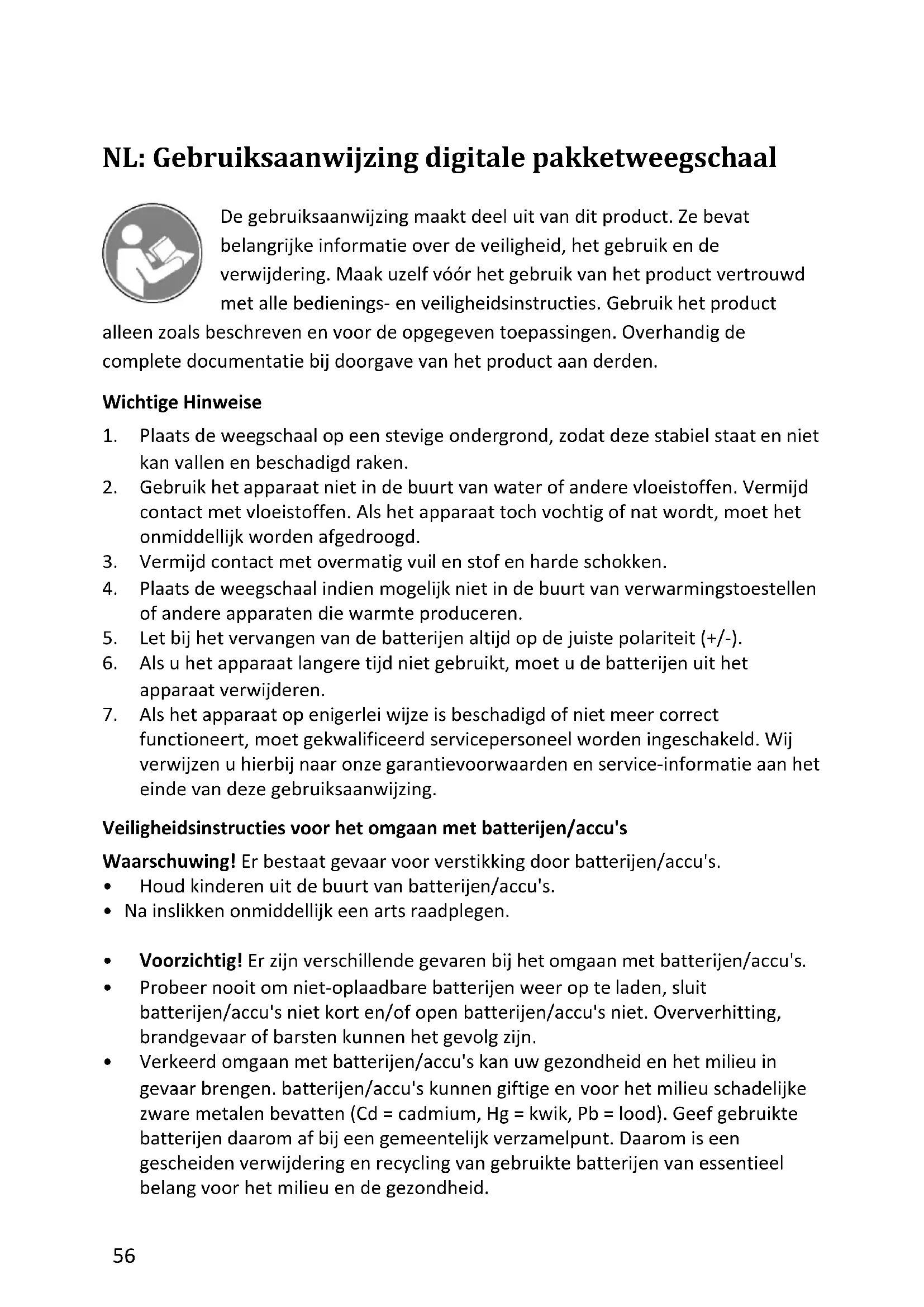 UK Authorised Representative (for authorities only) ProductIP (UK) Ltd. 8, Northumberland Av. London WC2N 5BY Proizvođač GO Europe GmbH Zum Kraftwerk 1 D-45527 Hattingen Njemačka www.go-europe.com service@go-europe.com56 NL: Gebruiksaanwijzing digitale pakketweegschaal De gebruiksaanwijzing maakt deel uit van dit product. Ze bevat belangrijke informatie over de veiligheid, het gebruik en de verwijdering. Maak uzelf vóór het gebruik van het product vertrouwd met alle bedienings- en veiligheidsinstructies. Gebruik het product alleen zoals beschreven en voor de opgegeven toepassingen. Overhandig de complete documentatie bij doorgave van het product aan derden. Wichtige Hinweise