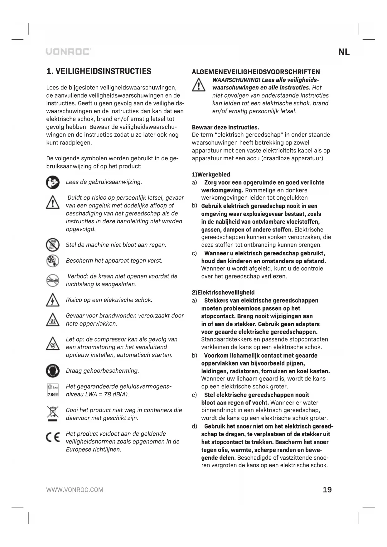 - Of stroomtoevoer aanwezig is (of de stekker op de juiste manier is ingestoken, de thermische zekering niet defect is). De compressor schakelt niet uit Als de compressor niet uitschakelt als de maximale druk is bereikt, zal de veiligheidsklep van de tank activeren. Het is noodzakelijk om voor reparatie contact op te nemen met het meest dichtstbijzijnde erkende servicecentrum. MILIEU Defecte en/of afgedankte elektrische of elektronische gereedschappen dienen ter verwerking te worden aangeboden aan een daarvoor verantwoordelijke instantie. Uitsluitend voor EU-landen Werp elektrisch gereedschap niet weg bij het huisvuil. Conform de Europese Richtlijn 2012/19/ EU voor Afgedankte Elektrische en Elektronische Apparatuur en de implementatie ervan in nationaal recht moet niet langer te gebruiken elektrisch gereedschap gescheiden worden verzameld en op een milieuvriendelijke wijze worden verwerkt. GARANTIE VONROC producten zijn ontworpen volgens de hoogste kwaliteitsstandaarden en gegarandeerd vrij van defecten, zowel materieel als fabrieksfouten, tijdens de wettelijk vastgestelde garantieperiode vanaf de eerste aankoopdatum. Mocht het product tijdens deze periode gebreken vertonen veroorzaakt door defecte materialen en/of fabrieksfouten, neem dan rechtstreeks contact op met VONROC. De volgende situaties vallen niet onder de garantie:
