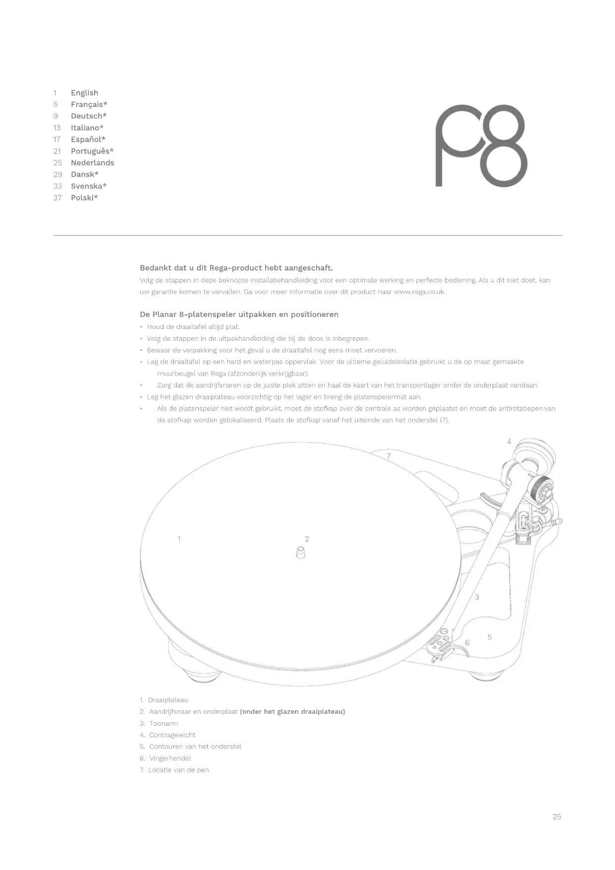 Bedankt dat u dit Rega-product hebt aangescha. Volg de stappen in deze beknopte installatiehandleiding voor een optimale werking en perfecte bediening. Als u dit niet doet, kan uw garantie komen te vervallen. Ga voor meer informatie over dit product naar www.rega.co.uk. De Planar 8-platenspeler uitpakken en positioneren