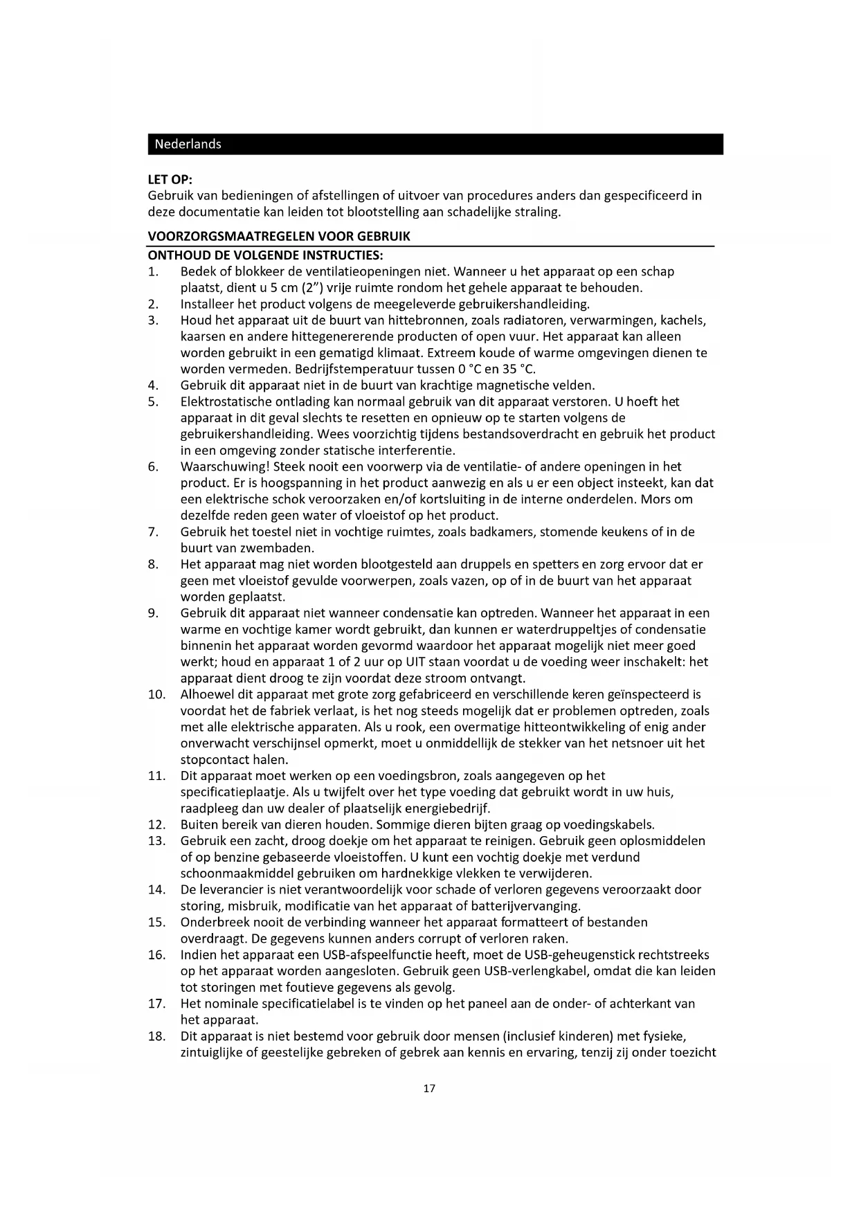 16. Indien het apparaat een USB-afspeelfunctie heeft, moet de USB-geheugenstick rechtstreeks