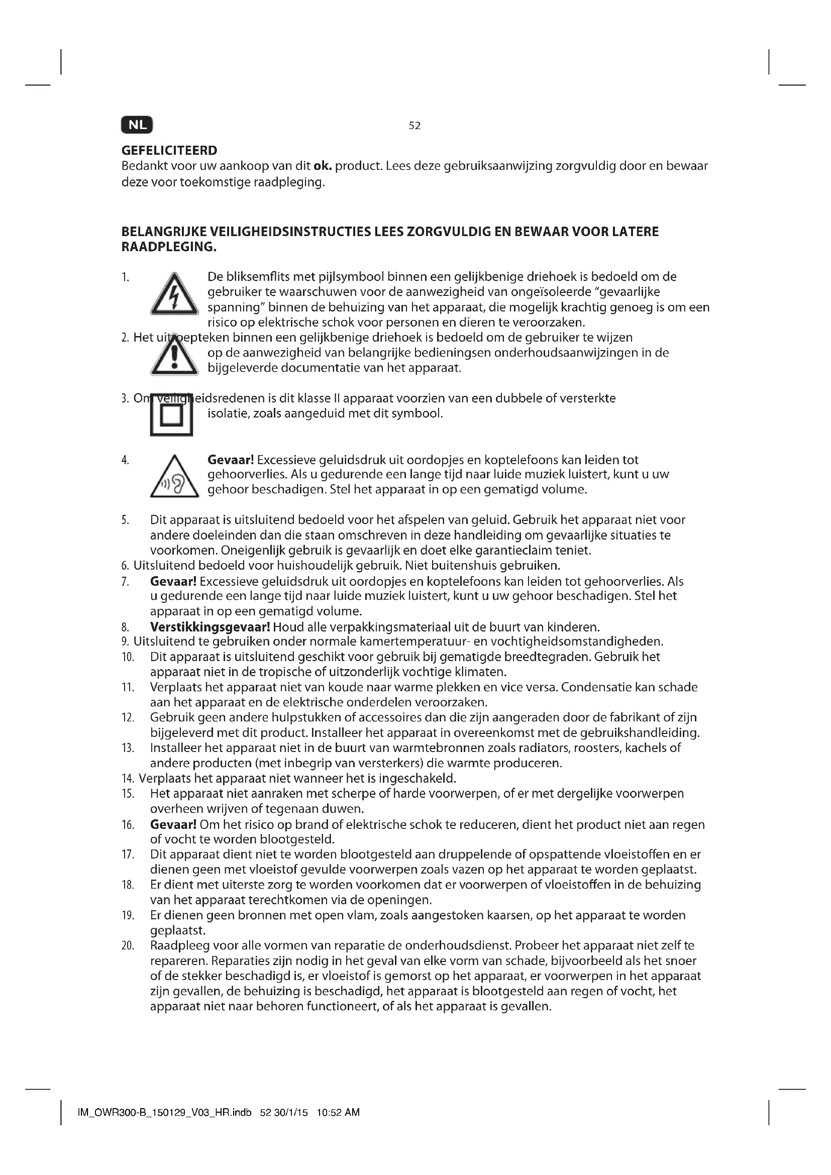 repareren. Reparaties zijn nodig in het geval van elke vorm van schade, bijvoorbeeld als het snoer of de stekker beschadigd is, er vloeistof is gemorst op het apparaat, er voorwerpen in het apparaat zijn gevallen, de behuizing is beschadigd, het apparaat is blootgesteld aan regen of vocht, het apparaat niet naar behoren functioneert, of als het apparaat is gevallen. IM_OWR300-B_150129_V03_HR.indb 52 30/1/15 10:52 AM53