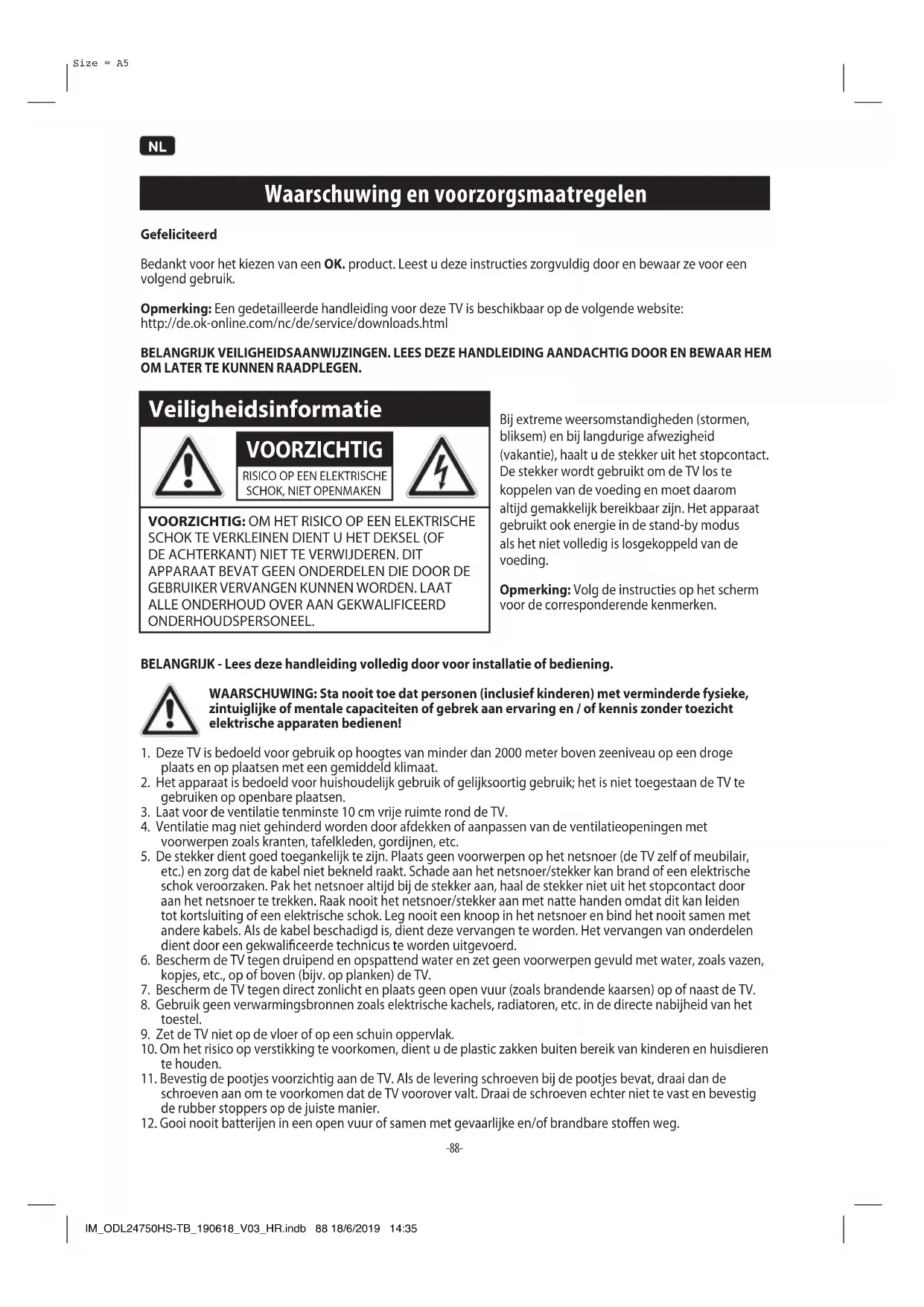 Waarschuwing en voorzorgsmaatregelen Gefeliciteerd Bedankt voor het kiezen van een OK. product. Leest u deze instructies zorgvuldig door en bewaar ze voor een volgend gebruik. Opmerking: Een gedetailleerde handleiding voor deze TV is beschikbaar op de volgende website: http://de.ok-online.com/nc/de/service/downloads.html BELANGRIJK VEILIGHEIDSAANWIJZINGEN. LEES DEZE HANDLEIDING AANDACHTIG DOOR EN BEWAAR HEM OM LATER TE KUNNEN RAADPLEGEN. Veiligheidsinformatie VOORZICHTIG