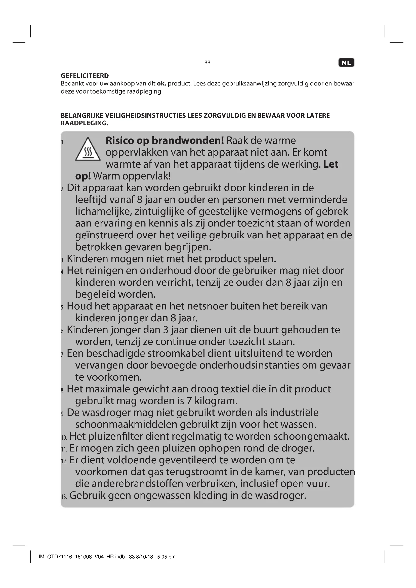 gebruik. BEOOGD GEBRUIK Dit product is ontworpen voor het drogen van kleding en textiel. Elk ander gebruik kan tot schade aan het product of tot letsel leiden. Dit product is alleen voor huishoudelijk gebruik, en niet voor commercieel gebruik geschikt. Imtron GmbH aanvaardt geen aansprakelijkheid voor schade aan het product, schade aan eigendommen of lichamelijk letsel als gevolg van onzorgvuldig of oneigenlijk gebruik van het product, of gebruik van het product die niet voldoet aan het doel opgegeven door de fabrikant. IM_OTD71116_181008_V04_HR.indb 35 8/10/18 5:05 pm36