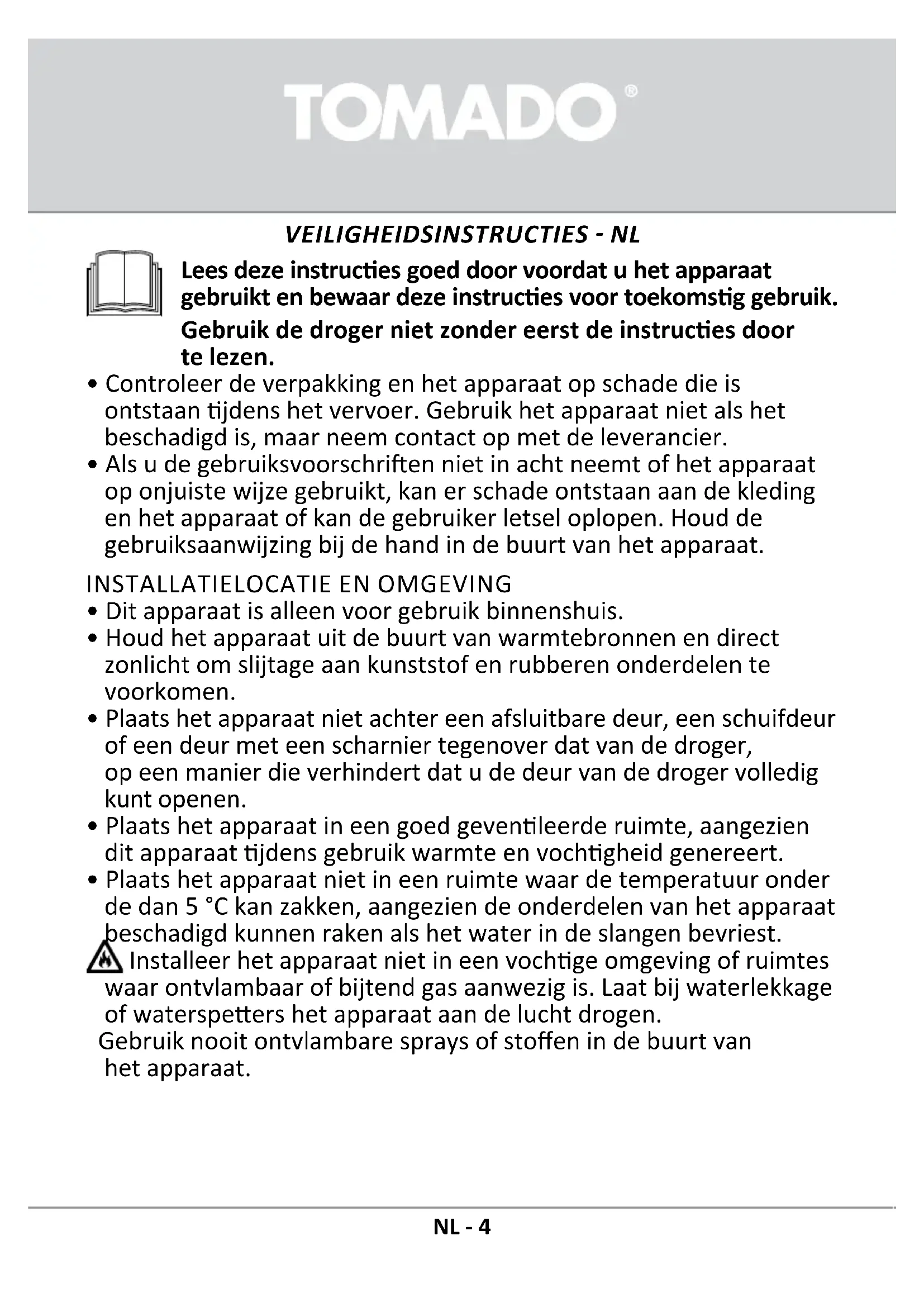 Lees deze instructies goed door voordat u het apparaat gebruikt en bewaar deze instructies voor toekomstig gebruik. Gebruik de droger nicht zonder eerst de instructies doorte lezen.
