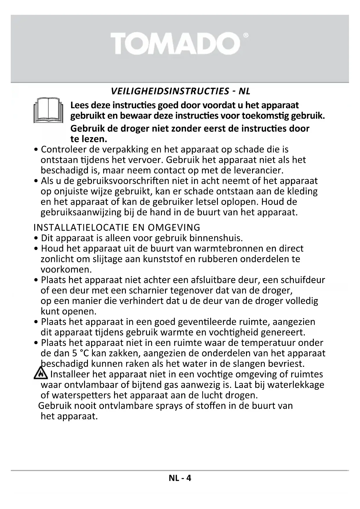 - Gebruik alleen producten die speciaal zijn ontworpen voor het drogen van wasgoed. Tomado is niet verantwoordelijk voor eventuele schade of verkleuringen aan pakkingen en kunststof onderdelen als gevolg van het onjuiste gebruik van bleekmiddelen of kleurstoen.