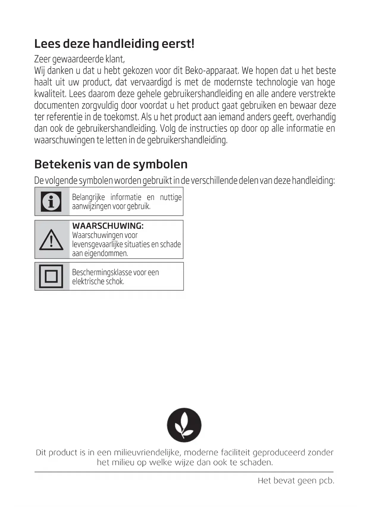- Toute chute de l’appareil peut le rendre non opérationnel ou l’endommager de façon permanente. 4 Nettoyage et entretienLees deze handleiding eerst! Zeer gewaardeerde klant, Wij danken u dat u hebt gekozen voor dit Beko-apparaat. We hopen dat u het beste haalt uit uw product, dat vervaardigd is met de modernste technologie van hoge kwaliteit. Lees daarom deze gehele gebruikershandleiding en alle andere verstrekte documenten zorgvuldig door voordat u het product gaat gebruiken en bewaar deze ter referentie in de toekomst. Als u het product aan iemand anders geeft, overhandig dan ook de gebruikershandleiding. Volg de instructies op door op alle informatie en waarschuwingen te letten in de gebruikershandleiding. Betekenis van de symbolen De volgende symbolen worden gebruikt in de verschillende delen van deze handleiding: