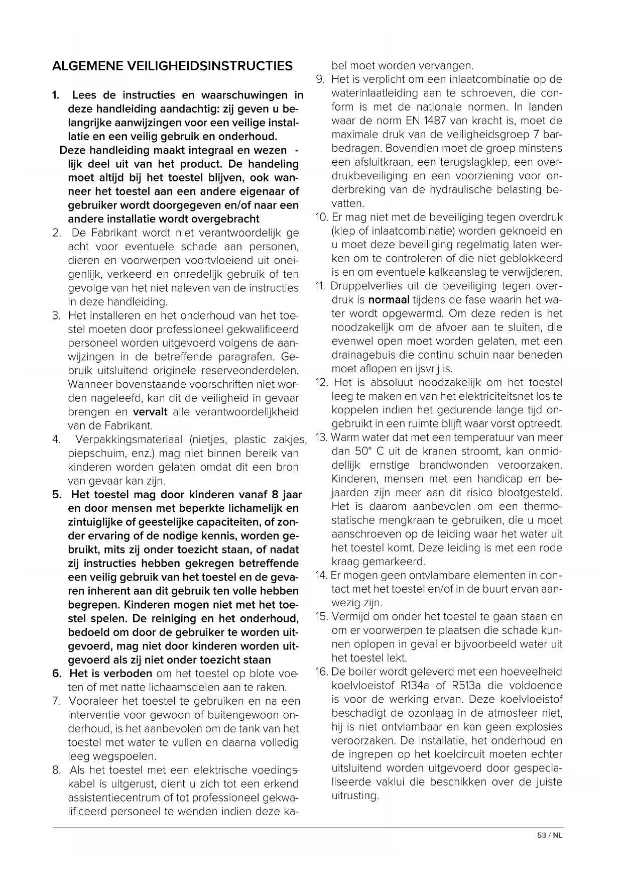 Het apparaat bevat koelgas van het type R134a/R513, wat niet in de atmosfeer mag geraken. Een definitieve uitschakeling van de boiler moet daarom door een bevoegde installateur worden uitgevoerd. ONDERHOUD (voor geautoriseerd personeel) Dit product is conform aan de Richtlijn WEEE 2012/19/EU. Het symbool van de doorgekruiste vuilnisbak op het apparaat of de verpakking ervan geeft aan dat het product aan het einde van de levensduur gescheiden van ander afval moet worden verzameld. De gebruiker moet de afgedankte apparatuur dus afgeven bij een geschikt gemeentelijk inzamel- centrum van elektrotechnisch en elektronische apparatuur. In plaats van het zelfstandige beheer is het ook mogelijk de af te danken apparatuur bij de dealer te brengen op het moment van aanschaf van een ander, equivalent apparaat. Bij dealers van elektronische producten met een verkoopoppervlak van min- stens 400 m² is het verder mogelijk om kosteloos, zonder enige verplichting tot aanschaf, afgedankte elektronische producten in te leveren met afmetingen van minder dan 25 cm. Een goede ge- scheiden afvalverwerking en daaropvolgend doorsturen van de afgedankte apparatuur voor milieuvriendelijke recycling, behan- deling en verwerking dragen ertoe bij om mogelijke negatieve gevolgen voor het milieu en de gezondheid te voorkomen en bevorderen het hergebruik en/of de recycling van de materialen waaruit de apparatuur bestaat. Voor meer informatie over de be- schikbare inzamelmogelijkheden dient u zich te wenden tot de gemeentelijke afvaldienst of tot de verkoper van het product. Het apparaat is niet voorzien van oplaadbare batterijen, maar als deze worden gebruikt moeten ze voordat het apparaat wordt af- gedankt worden verwijderd en worden weggegooid in special verzamelbakken. De behuizing van de batterijen zit achter de frontale lijst.69 / NL