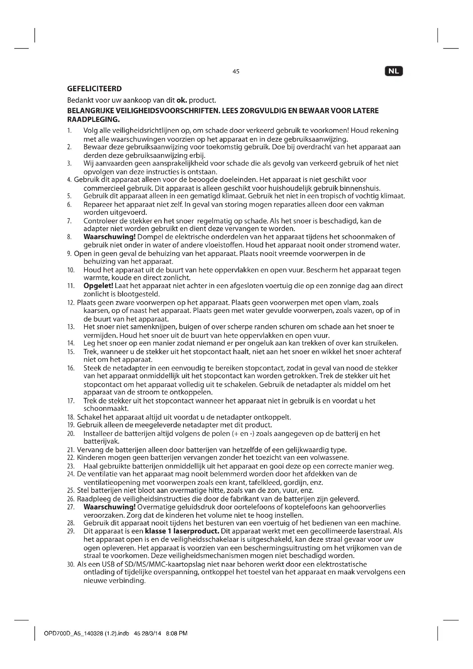 GEFELICITEERD Bedankt voor uw aankoop van dit ok. product. BELANGRIJKE VEILIGHEIDSVOORSCHRIFTEN. LEES ZORGVULDIG EN BEWAAR VOOR LATERE RAADPLEGING.