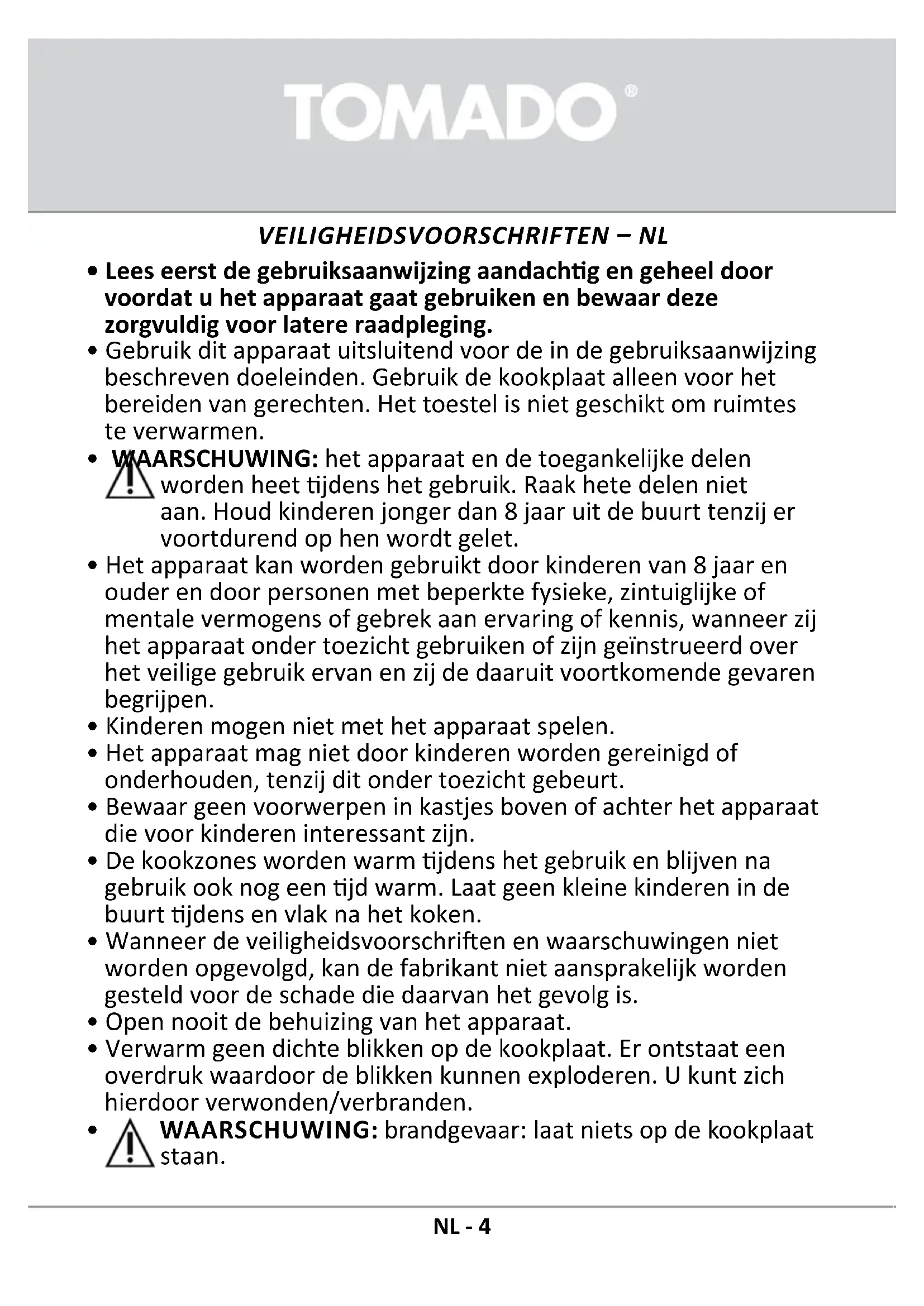 - WAARSCHUWING: brandgevaar: laat niets op de kookplaat staan. VEILIGHEIDSVOORSCHRIFTEN – NL NL - 4• WAARSCHUWING: koken met vet of olie op een kookplaat zonder toezicht kan gevaarlijk zijn en kan brand tot gevolg hebben. Probeer NOOIT de brand te blussen met water, maar zet het apparaat uit en dek de vlammen daarna af met bijvoorbeeld een deksel of een blusdeken.