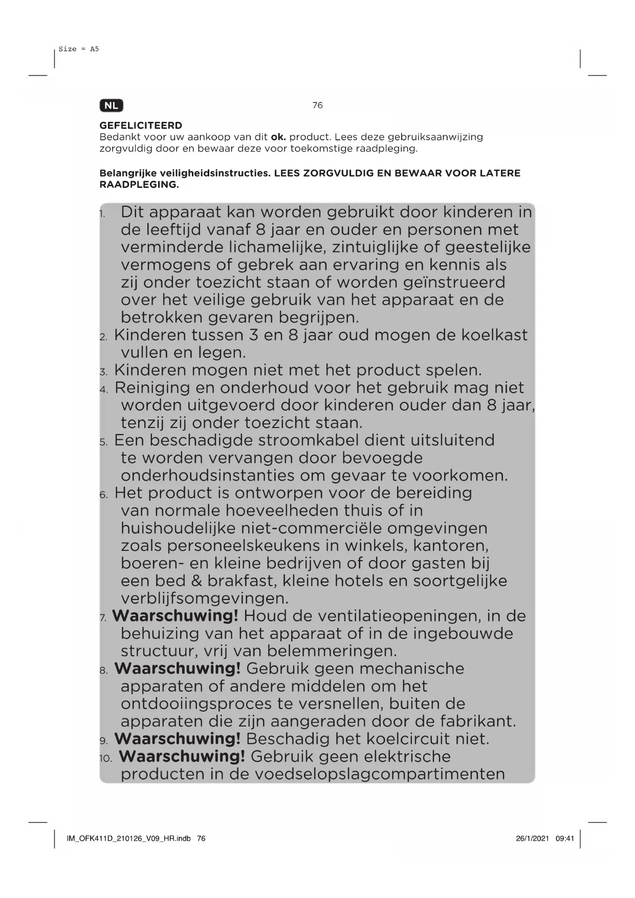- Voor het koelgedeelte wordt een temperatuurstand van 5 °C aanbevolen, onder deze aanbevolen stand is de uiterste bewaartijd in de koelkast 3 dagen. IM_OFK411D_210126_V09_HR.indb 84IM_OFK411D_210126_V09_HR.indb 84 26/1/2021 09:4126/1/2021 09:4185