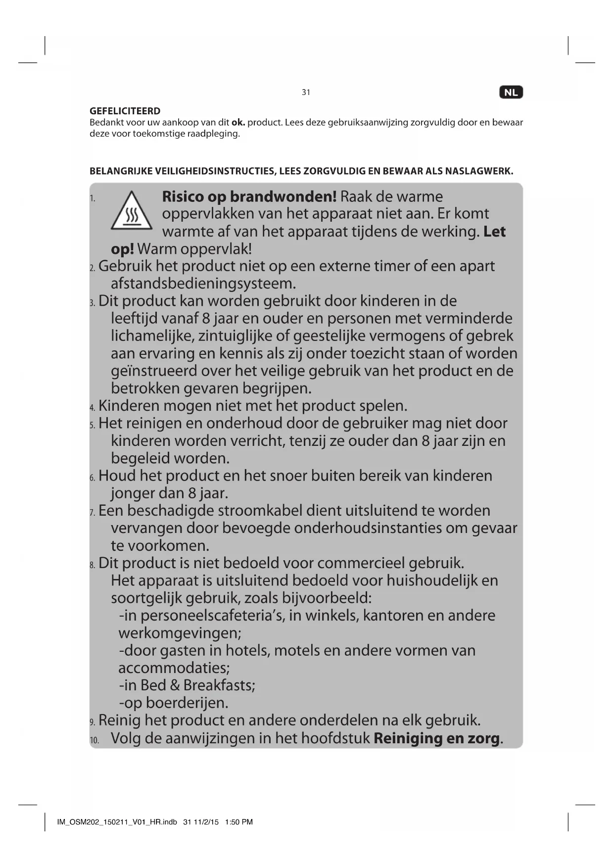 apparaat uitsluitend m.b.v. de handgrepen. BEOOGD GEBRUIK Het apparaat dient alleen gebruikt te worden voor voedselbereiding. Elk ander gebruik kan tot schade aan het product of tot letsel leiden. IM_OSM202_150211_V01_HR.indb 32 11/2/15 1:50 PM33