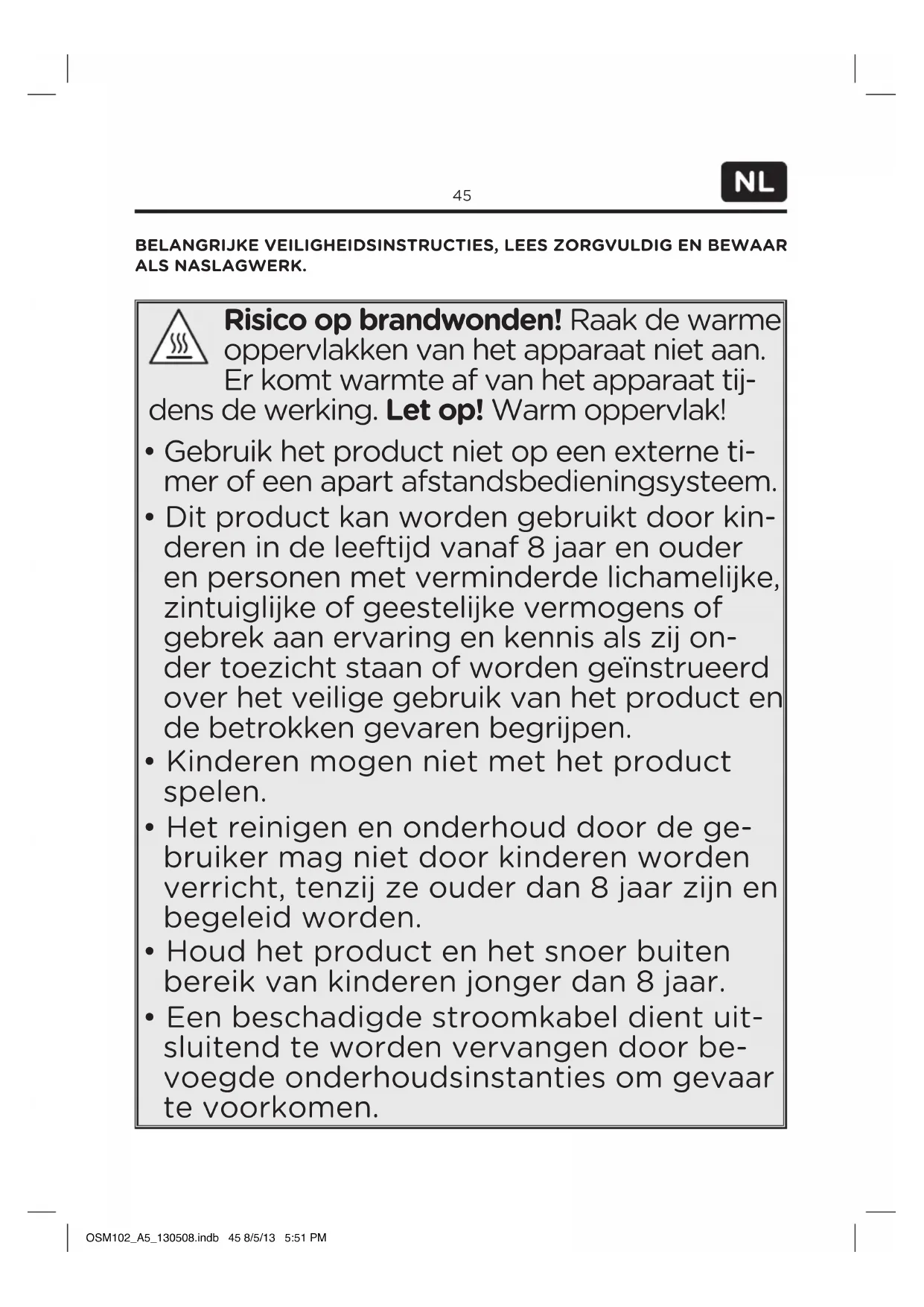 - Bewaar het product in een droge, koele plaats die beschermd is tegen vocht en direct zonlicht. Houd dit product buiten het bereik van kinderen. SPECIFICATIE Ingangsspanning: 220–240 V~, 50/60 Hz / Uitgangsspanning: 750 W / Beschermingsklasse I AFVAL Gooi dit apparaat niet weg bij het huisafval. Lever het in bij een inzamelpunt voor de recycling van elektrische en elektronische apparatuur. Op deze manier helpt u bronnen te sparen en het milieu te beschermen. Neem contact op met uw detailhandelaar of met de lokale autoriteiten voor meer informatie. OSM102_A5_130508.indb 50 8/5/13 5:51 PM51 Size - A5 ISTOTNE INSTRUKCJE BEZPIECZEŃSTWA. PRZECZYTAJ I ZACHOWAJ DO WGLĄDU. Ryzyko poparzeń! Nie dotykać gorą- cych powierzchni produktu. W trakcie eksploatacji istnieje ryzyko nagrzania się produktu. Uwaga! Gorące powierzchnie!