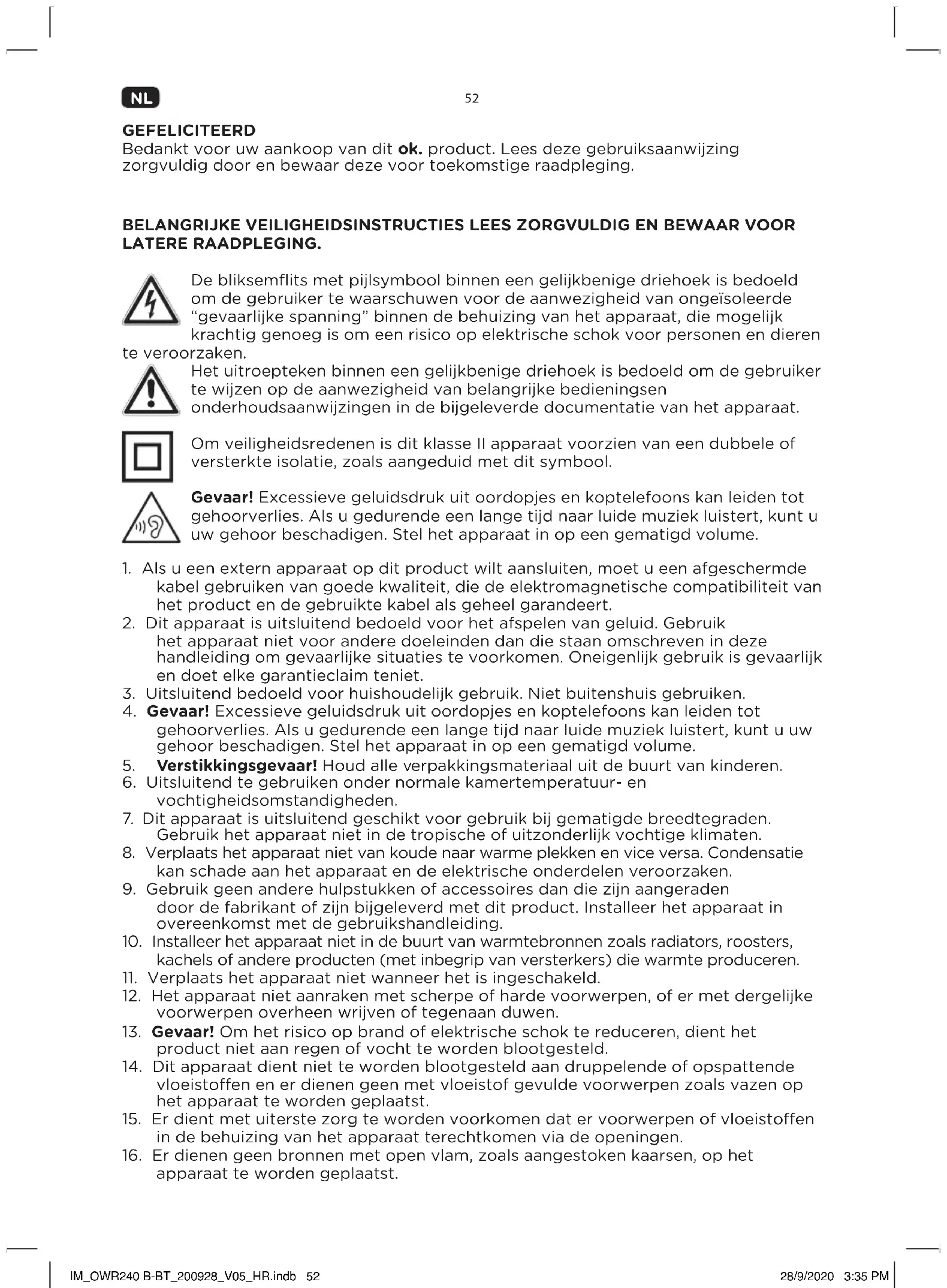 GEFELICITEERD Bedankt voor uw aankoop van dit ok. product. Lees deze gebruiksaanwijzing zorgvuldig door en bewaar deze voor toekomstige raadpleging. BELANGRIJKE VEILIGHEIDSINSTRUCTIES LEES ZORGVULDIG EN BEWAAR VOOR LATERE RAADPLEGING. De bliksemflits met pijlsymbool binnen een gelijkbenige driehoek is bedoeld om de gebruiker te waarschuwen voor de aanwezigheid van ongeïsoleerde “gevaarlijke spanning” binnen de behuizing van het apparaat, die mogelijk krachtig genoeg is om een risico op elektrische schok voor personen en dieren te veroorzaken. Het uitroepteken binnen een gelijkbenige driehoek is bedoeld om de gebruiker te wijzen op de aanwezigheid van belangrijke bedieningsen onderhoudsaanwijzingen in de bijgeleverde documentatie van het apparaat. Om veiligheidsredenen is dit klasse II apparaat voorzien van een dubbele of versterkte isolatie, zoals aangeduid met dit symbool. Gevaar! Excessieve geluidsdruk uit oordopjes en koptelefoons kan leiden tot gehoorverlies. Als u gedurende een lange tijd naar luide muziek luistert, kunt u uw gehoor beschadigen. Stel het apparaat in op een gematigd volume.