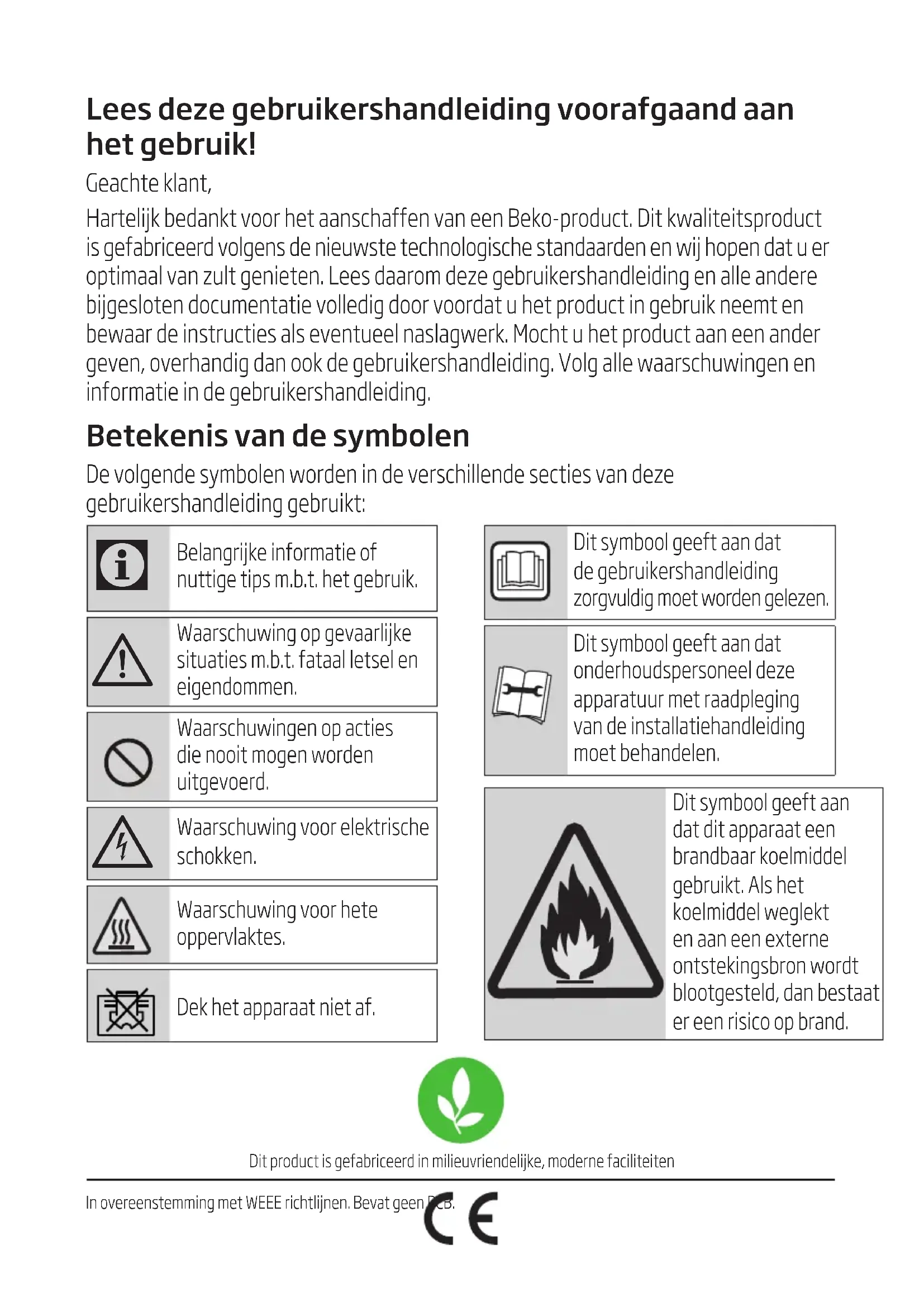 het gebruik! Geachte klant, Hartelijk bedankt voor het aanschaffen van een Beko-product. Dit kwaliteitsproduct is gefabriceerd volgens de nieuwste technologische standaarden en wij hopen dat u er optimaal van zult genieten. Lees daarom deze gebruikershandleiding en alle andere bijgesloten documentatie volledig door voordat u het product in gebruik neemt en bewaar de instructies als eventueel naslagwerk. Mocht u het product aan een ander geven, overhandig dan ook de gebruikershandleiding. Volg alle waarschuwingen en informatie in de gebruikershandleiding. Betekenis van de symbolen De volgende symbolen worden in de verschillende secties van deze gebruikershandleiding gebruikt: Dit product is gefabriceerd in milieuvriendelijke, moderne faciliteitenIn overeenstemming met WEEE richtlijnen. Bevat geen PCB.