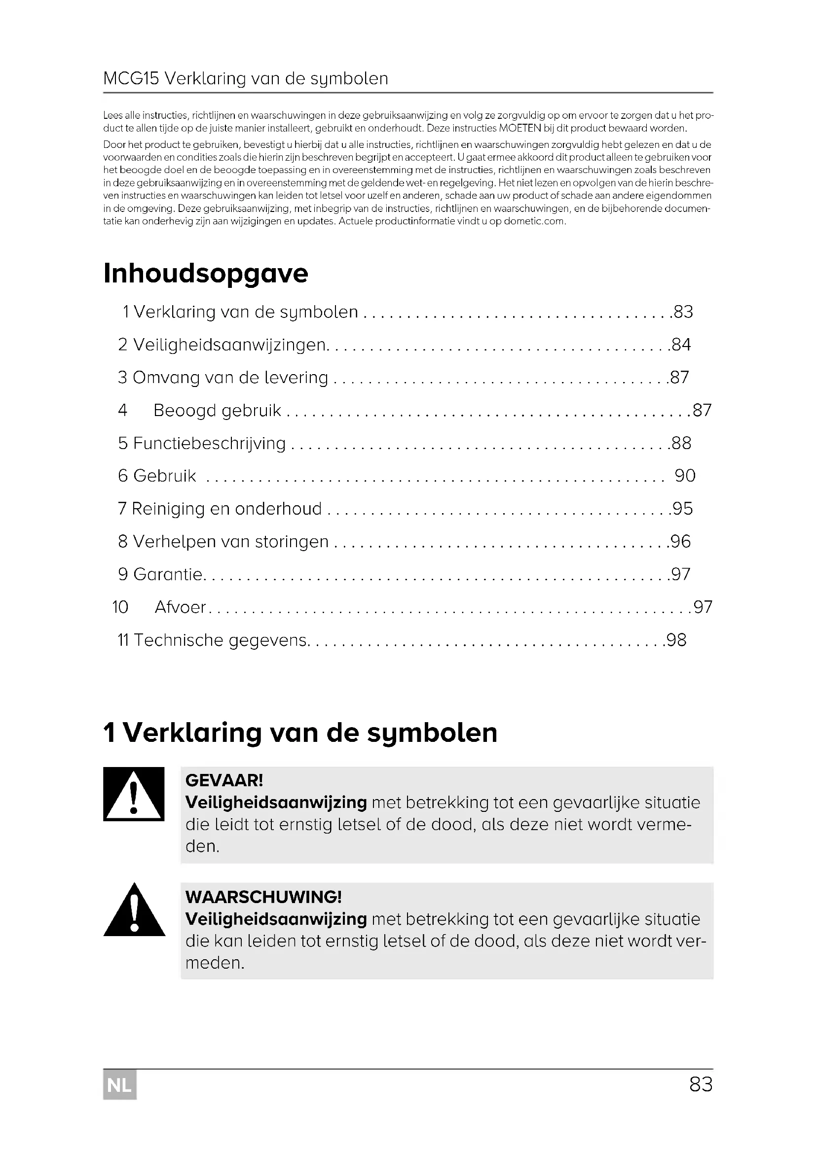 GEVAAR! Veiligheidsaanwijzing met betrekking tot een gevaarlijke situatie die leidt tot ernstig letsel of de dood, als deze niet wordt verme- den. WAARSCHUWING! Veiligheidsaanwijzing met betrekking tot een gevaarlijke situatie die kan leiden tot ernstig letsel of de dood, als deze niet wordt ver- meden. MobicoolMCG15_OPM_4445103306_EMEA16_202x-xx-xx.book Seite 83 Freitag, 16. April 2021 2:17 14NL Veiligheidsaanwijzingen MCG15