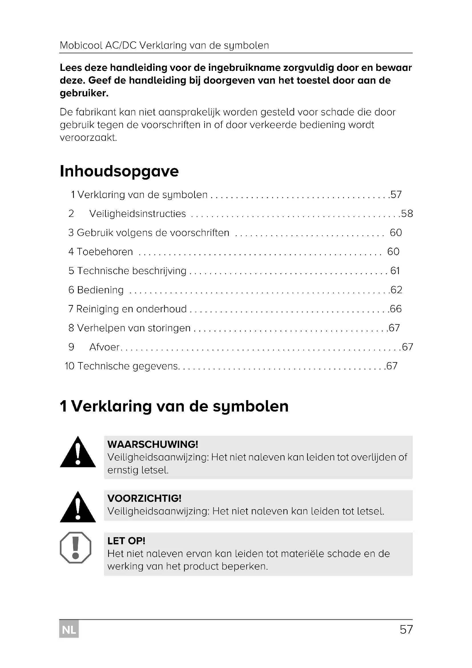 WAARSCHUWING! Veiligheidsaanwijzing: Het niet naleven kan leiden tot overlijden of ernstig letsel. VOORZICHTIG! Veiligheidsaanwijzing: Het niet naleven kan leiden tot letsel. LET OP! Het niet naleven ervan kan leiden tot materiële schade en de werking van het product beperken. Mobicool-AC-DC--O-16s.book Seite 57 Montag, 8. Januar 2018 6:11 18NL Veiligheidsinstructies Mobicool AC/DC